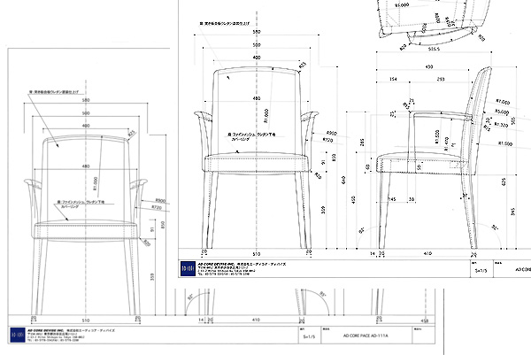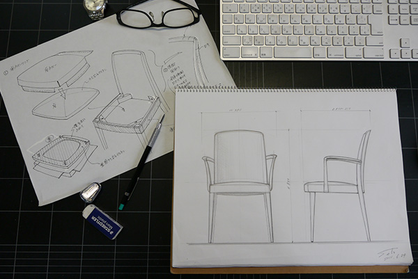 デザインの仕事をしていて大切な事は、いかに立体的に物の形を考えられるかです。紙に描くスケッチを陰影を付けて描くのも、完成の姿を立体的にイメージするからです。家具の三面図は平面ですが、外形線、内接線や補助線など様々な線に強弱をつけて、平面だけど立体的に見えるような描き方を心がけます。全て同じ線で描いてしまうと、のっぺりとした図面になり、図面から形が伝わってきません。職人さんが作る時に間違わないように、図面から浮き出て見える図面を描くのが、図面描きのこつで、それが死命だと、学生の頃にアルバイトしていた家具工場の設計の方に教えられた事を今でも思い出します。今は使わなくなりましたが、トレーシングペーパーで椅子の図面を描いていた頃は、鉛筆の筆圧や固さを変えながら描いていました。それも紙面の中にバランス良く描けるかも大切です。