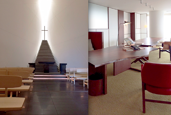 内覧会は受付順に数名のグループに分かれての見学。ショーキッチンを備えた「アンダーズ・スタジオ」はオーク材をダイナミックに使ったインテリア、客室で驚いたのがデスクや洗面台にウォールナットの耳付無垢板を惜しげもなく使っている事。客室数からしても想像を超えた量です。無垢板は経年変化の動きがあるので、取り扱いが非常に難しいので本当に驚きました。スィートルームや屋上階のチャペル見学後、ルーフトップスタジオでアンダーズホテルプロジェクトに関するレクチャーにも参加しました。講師の中田氏は日本のホテル計画の草分け的な方で、アンダーズプロジェクトをはじめハイアットグループのホテルプロジェクトを多数手がけてきた方。ホテル計画のポイントや苦労話、インテリアに関わる興味深いお話を聞かせていただきました。