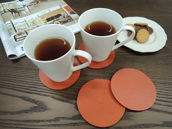 人気の本革コースターのオレンジ色がエーディコア・ディバイズショールームに入荷しました。