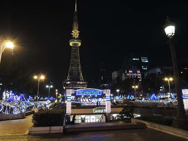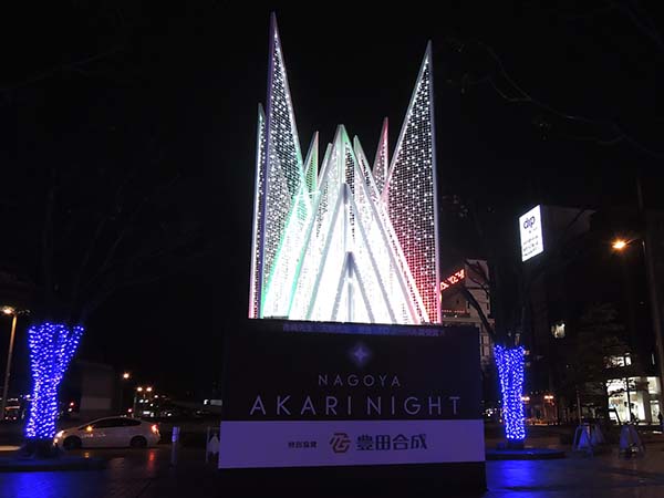 ショールーム近隣の街並では、『NAGOYAアカリナイト』が開催されています。こちらのイベントが今年で5周年を迎え、今年から開催会場を大幅に拡大しました。名古屋テレビ塔開業60周年を機にリニューアルされたテレビ塔のライトアップ演出に加え、公園内のイルミネーションをリフレッシュ…アカリのテーマパークとして展開。会場内のもちの木広場に設置されたシンボルオブジェ「レインボーツリー」には、フルLED投光器による演出を行い、栄の街を華やかに彩っています。カップルや観光客の方でとても賑わっていて、街も年末に向け活気に溢れています。