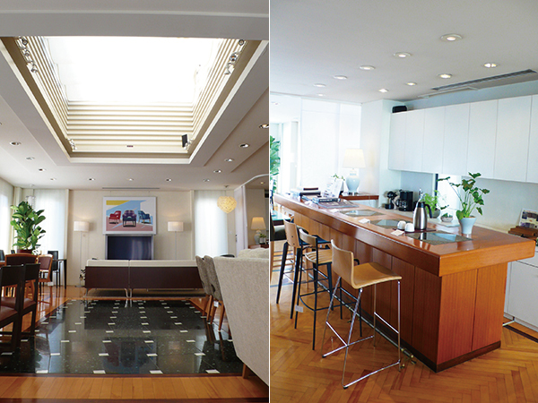 エーディコア・ディバイズ東京・広尾ショールームの建物は、30年近く前に建てられたもので、当初個人の住宅だった所を、某著名人の事務所や店舗等を経て当社が本社ショールームとしてオープンして15年が経ちます。随所に贅を尽くした作りが見受けられ、まず3階までのガラス張りの吹き抜けが目を引きます。吹き抜け天井の一部は、鉄骨とガラスで緩やかなカーブを持たせたデザイン。床材は黒の大理石張りで磨き上げられ、壁面は御影石を贅沢に使用しています。金色に輝く真鍮の手すりの階段を登ると3階は天窓から柔らかな光が入る空間で、床材は杉綾のフローリングとモザイクの大理石の組み合わせ。当初から有ったバーカウンターは天板にもモザイクの大理石がはめ込まれ、厚みのある無垢材の天板が上質な印象です。今ではこれだけの材料を取り寄せるのも大変そうですね。