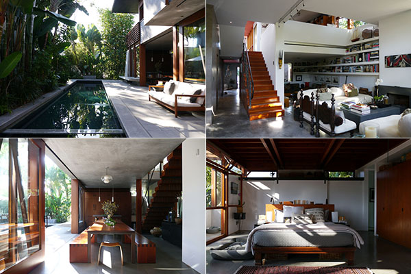 海に近いベニスに建つ建築家の環境住宅。環境住宅の建築で有名な建築家デイビット・ハーツの住宅で、様々な環境に配慮した装置や新しい機器を実験しながら家族と住まう住宅です。1995年から建築が始まり今も改装が続いています。中庭のプールが南洋の雰囲気を出していて、そのプールに面した部屋がパーティスペースになっていて、住宅を作るために機器を提供した企業にその機器の発表の場として貸出すというアイデアで、いつも最新式の機器を使う住宅として進化しています。
