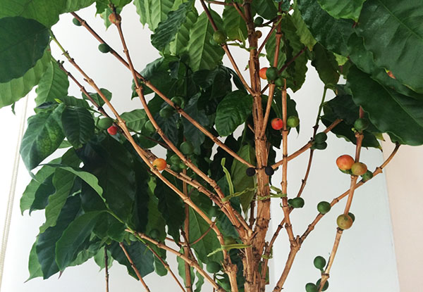 入口正面の奥に対で置いているコーヒーの木。窓際に置いてある事もあって、赤い実が付きはじめています。葉は少なめですが、実があるうちに枝が上に向くように所々固定する事で、全体に丸い形にする事が出来ます。冬に花をつけていた金のなる木も、次の冬に向けて太陽光をたくさん吸収中!夏場は水やりを控えると11月頃に薄ピンクの小花がたくさん咲くのだそうで、今から楽しみです。