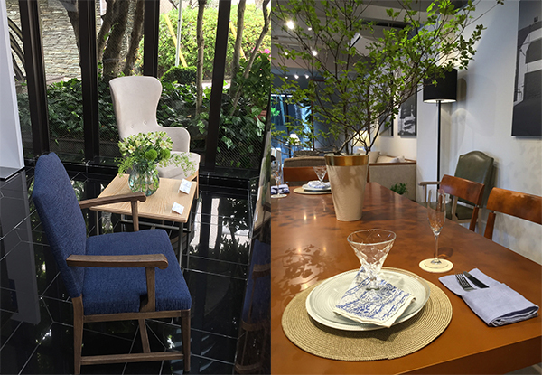 今回のテーマカラーは『ブルー』。クッションや小物に取り入れて、夏を先取りした爽やかなコーディネートにしています。それぞれのブランドイメージに合わせ、違った雰囲気を出しています。AD COREはガラスとシャープな葉や石を使い、モダンでクールな印象に。A-modeはネイビー×ホワイトのクッションやロープを使った小物でマリンテイストをプラスしています。無垢天板のダイニングテーブル上のアジサイはグリーンからブルーに色が変化するので、少しずつ変わっていくのが楽しみです。NEO CLASSICOには草花のモチーフを取り入れ、爽やかな雰囲気の中にもエレガントさをプラス。NEO CLASSICO Heritageにはグレイッシュなブルーをプラスして大人っぽい雰囲気にしています。