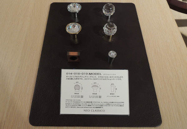 またデスクシャンデリアは、精密にカットされたクリスタルが調光機能付きの柔らかな光に照らされて、きらめくラグジュアリー空間を演出してくれます。インテリアのポイントとしてお部屋に置いてみてはいかがでしょうか?エーディコア・ディバイズ名古屋・栄ショールームにはデスクシャンデリアの展示がございますので、気になる方は是非この輝きを見にいらしてください。把手のパーツサンプルは各ショールームにご用意しておりますので、お気軽にお問い合わせ下さい。
