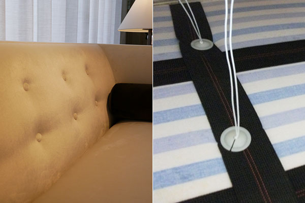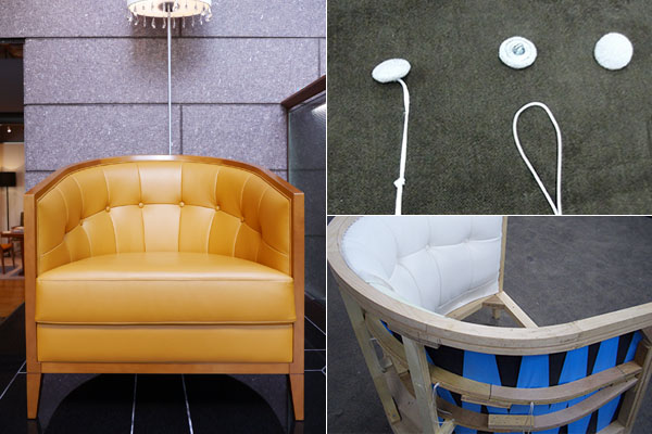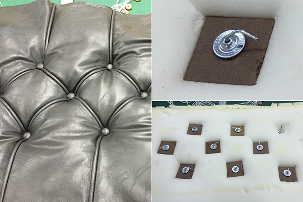 ボタン絞りのソファの作り方はデザイン的に様々な手法がありますが、浅くボタンを付ける場合は、布の伸びを利用しカーブさせて少しだけこませる意匠や、深くボタンを付ける場合は背にシワのよらないように一枚一枚縫い合わせをして深く止める昔ながらの方法があり、ボタンの留め方は洋服と同じで、昔も今も丈夫な糸(昔は麻でしたが、今はナイロンやビニロン)が使われ、その糸を木枠に釘やタッカーで止めたり、ボタンで留める方法など、背の固さや動きによって留める方法は沢山ありますが、クギで止める方法はしません。お子さんが飛び跳ねたり、重量オーバーで万が一、木枠が壊れた時に人に危害が及ぶ方法で止めるべきではありません。人の安全性を第一に、それを考えながら職人さん達は物作りをしています。