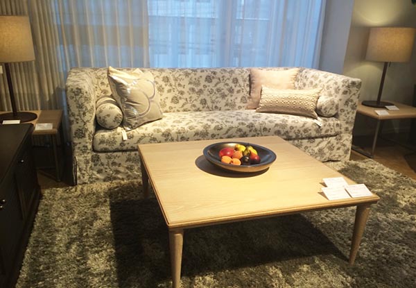 まずは、エーモードから定番のMD-105&MD-101のダイニングセットをご紹介します。スチールの脚が特徴的なスタイリッシュなダイニングセットです。天板はウォールナット色、椅子の生地は薄グレーなのでどんな空間にも合わせて頂けます。アームチェアにはオプションの把手が付いているので、動かすのにも便利なのはもちろん汚れも軽減されます。テーブルサイズはW1500でアームチェア、サイドチェア各2脚ずつのセットです。もうひとつは、去年発表した新作ソファです。ネオクラシコ ヘリテージの3PソファNC-055Cは形が非常に綺麗で座り心地も絶妙です。花柄のスリップカバーを外してお使い頂く事も可能です。もちろんスリップカバーだけ追加でご購入頂くこともできます。