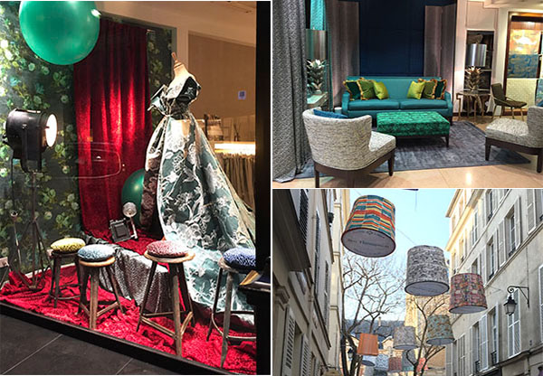 パリ到着初日は市内で開催されているParis Deco Off へ。今年が3年目になるParis Paris Deco Offは,パリ市内のテキスタイルメーカーやエージェントのショールームが100以上参加するイベントで、一同に新作をみる事ができます。大きく分けて2つのエリアで開催されていて、左岸のサン・ジェルマン・デ・プレを中心にしたエリアと、右岸のヴィクトワール広場付近のエリア(主にMail通り)です。各社ともウィンドウやディスプレイに趣向を凝らしており、ショールームを廻っていると今年のトレンドが見えてきます。今回はグリーンのファブリックを使ったディスプレイが目立ちました。青みのグリーンやピーコックグリーン、カーキなどのバリエーションがとても豊富で、動植物柄も印象的でした。いつもはウィンドウから眺めているだけのショールームにも中に入る事ができ、貴重な経験でした。