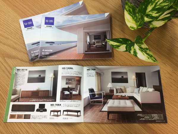 ミニと言っても、内容は盛りだくさんです。エーディコア、ネオクラシコ、エーモードの3つのブランドの代表的な製品を分かりやすくまとめて掲載し、各商品の単品の写真やアメリカ西海岸の住宅をお借りして撮影したイメージ写真など、充実の内容となっています。イメージ写真は家具の大きさやサイズ感の参考にもして頂けます。ディスプレイ、内装などもぜひ参考になさってください。ブランドの説明や裏表紙には各ショールームの地図も掲載していますので、ぜひ御来店前にご請求ください。