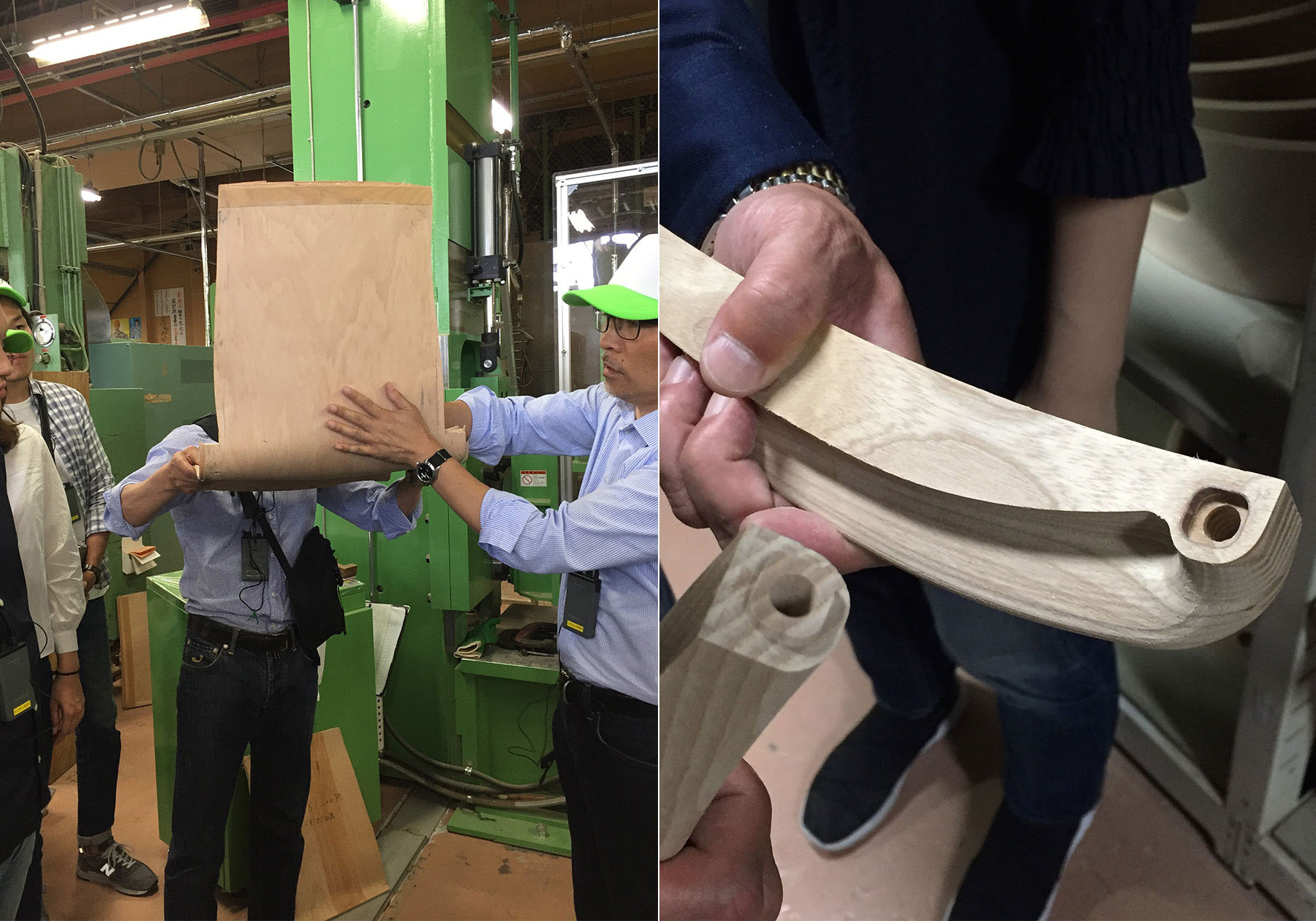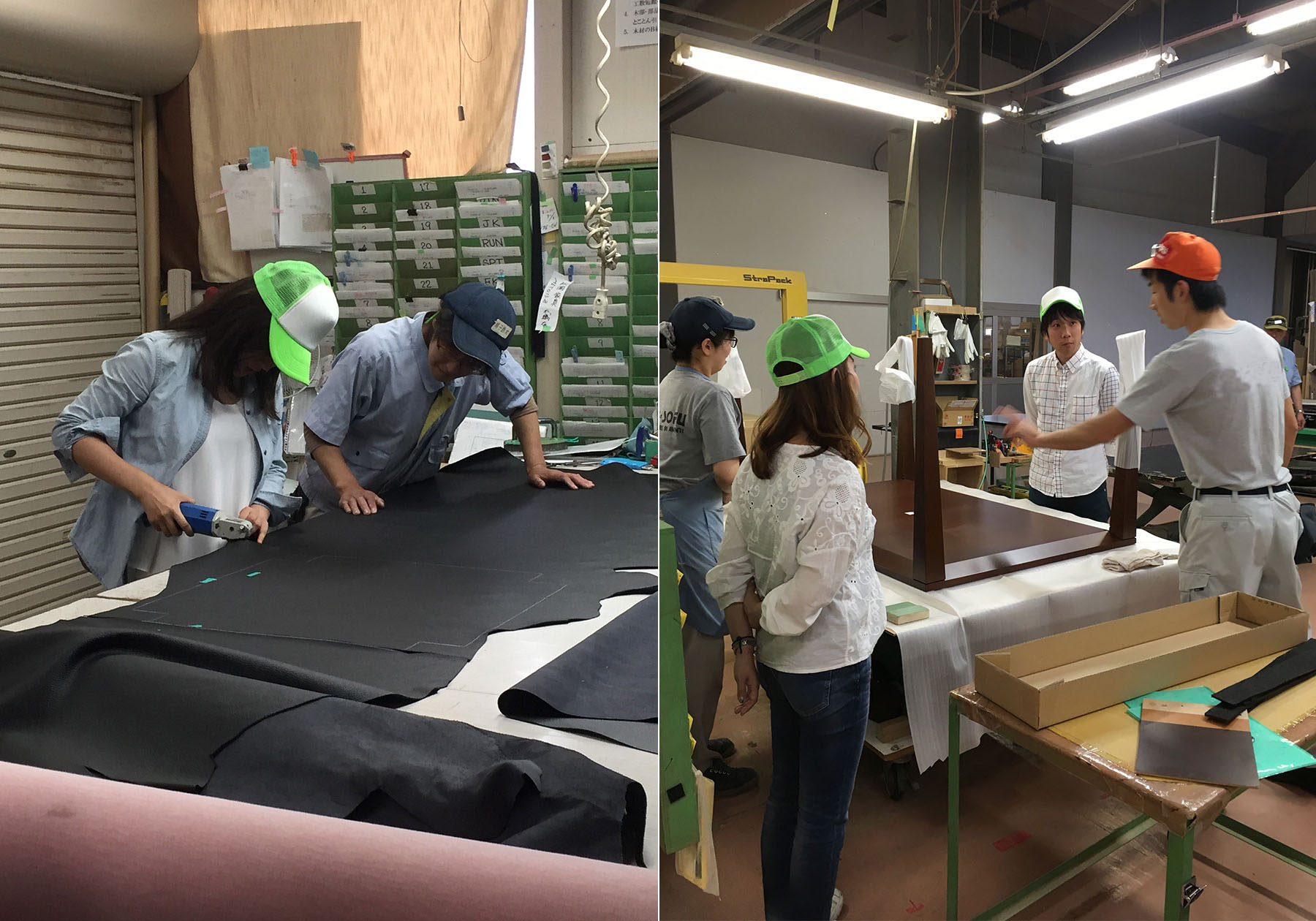 工場研修は日頃お客様と接している私たちにとって、大変貴重な経験の場です。木材や接着剤、加工機械や加工方法など製品が完成するまでの様々な工程を学びます。その中でも私がよく見ておこうと心がけているのは、製造途中の段階です。普段は完成品の状態を見ていますので、中身の構造がどのようになっているか見る機会はほとんどありません。特に椅子は数多くの部材を組立ててできています。ひとつひとつの部材の仕口がなぜそのようになっているかお話を伺うと、強度を出すための工夫が分かります。また、椅子やラウンジチェアはウレタンやファブリックを張る前の状態を見ながら、説明を伺うと座り心地のこだわりを理解する事ができます。当日はAD COREブランドの製品が製造ラインをたくさん流れており、様々な工程を目にする事ができました。最後は数人ずつ分かれて作業実習を体験し、工場の皆さんのプロフェッショナルな技を目にし、大変さを実感する事ができました。