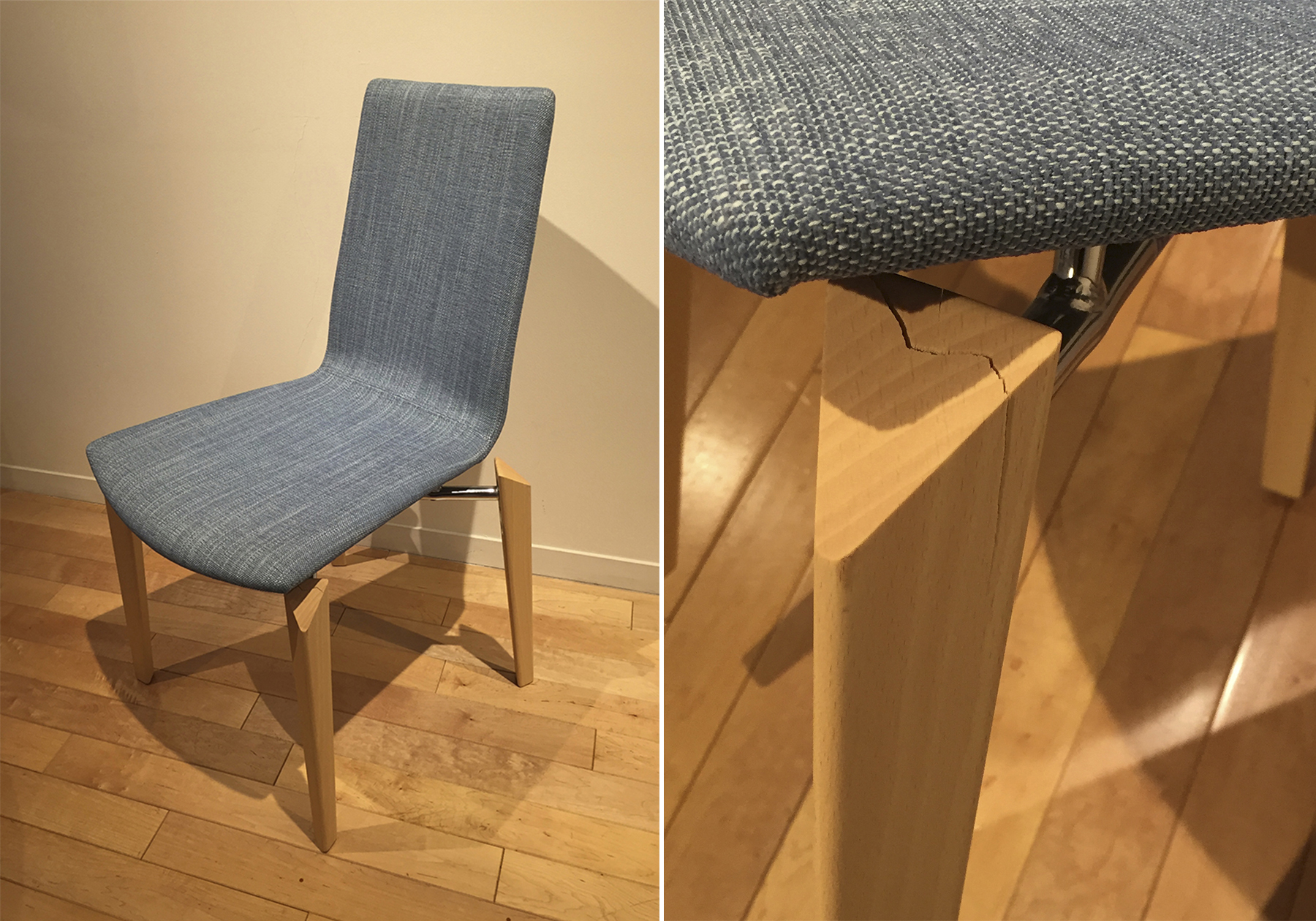 先日、以前CERVOⅡ(AD-961)のチェアをご購入いただいたお客様からご連絡がありました。お引越しの準備中に落としてしまい、前脚が1本割れてしまったとのことでした。状態を確認したところ、脚の上部に亀裂が入っておりました。