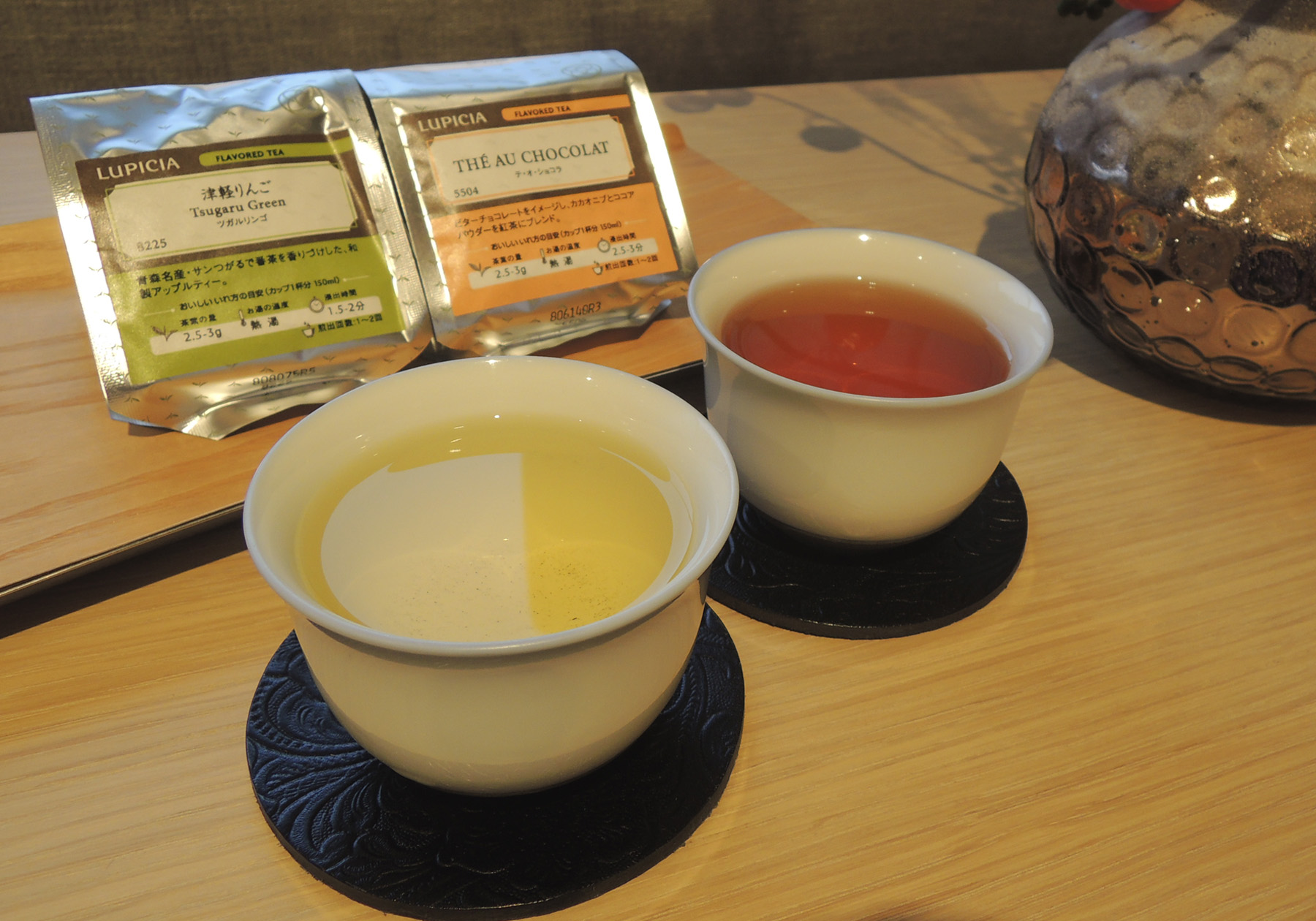 番茶をベースに、果汁たっぷりの豊潤な青森名産のりんご・サンつがるをイメージして香りづけした「津軽りんご」は和製アップルティーの味わいで、スッキリと秋の果実をお楽しみ頂けます。もう一つの「テ・オ・ショコラ」はビターチョコレートをイメージし、カカオニブとココアパウダーをブレンドした深いカカオの香りで、チョコレート好きも納得のお味です。ストレートで大人の味わいを楽しんでも、ミルクを加えたり、リキュールを垂らしたりしても美味だそうです。チョコレートらしさを出した本格派の風味は、ゆっくりリラックスしたい時にもおすすめです。