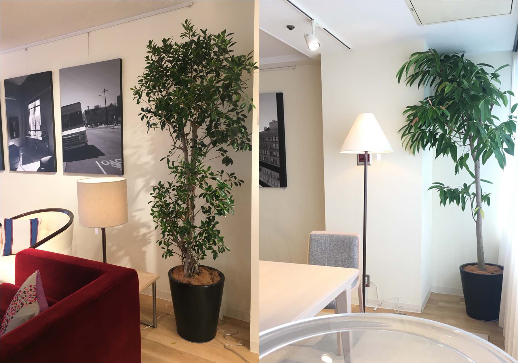 新しくなった植物は、木の幹や葉振りもしっかりとした樹木のショウナンゴム、ガジュマルです。葉がしっかりとしている植物は比較的育てやすく、お手入れも楽にできます。シンボルツリーにもなる柱サボテンはモダンヴィンテージな空間にも良く合います。最近ではインテリアには欠かせない存在の観葉植物。お部屋にも家具にもマッチする植物は空間を引き立たせてくれます。植物には、癒しや安らぎの効果もあるので、是非取り入れてみてはいかがでしょうか?