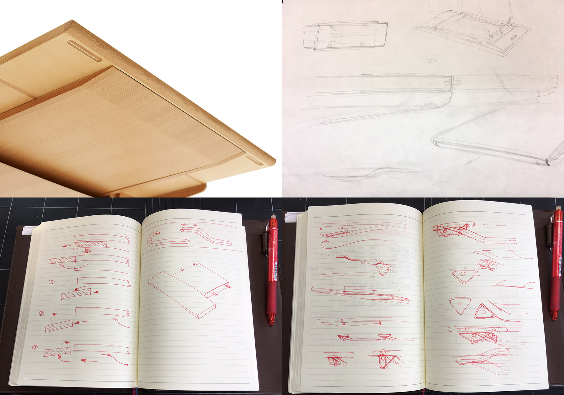 新作の伸長式のテーブルは引出しのように天板が出てきて、天板のトップと同じ高さに上がり、固定する事が条件で、スライドと上昇して戻り止まるという動作が求められました。最初に動作姿を決めて機構を考えて行き、動作するスライド量から脚の位置が決まり、動きから機能のスライドレールを考えました。今はCADがあるので、精度ある図面と動きのシュミレーションを描く事ができるので、昔のように手書きの図面から想像するだけでなく、比較的早く形にする事ができました。でも、最初は頭の中の動きを手書きのスケッチにして、出張中の機内でペンで手帳に書いた絵が基本設計をして設計をしました。動きは模型を作って確認し、実際の伸長時と納まり時のカクッとある手応えのあるキャッチは試作時に修正して完成させました。完成した形はシンプルで動きもスムーズなので、サラッとしたデザインと設計に見えますが、頭の中では何度もシュミレーションして創り上げた物なんです。私自身、サラッと簡単に見えて実は難しいデザインの方が好きなんです。
