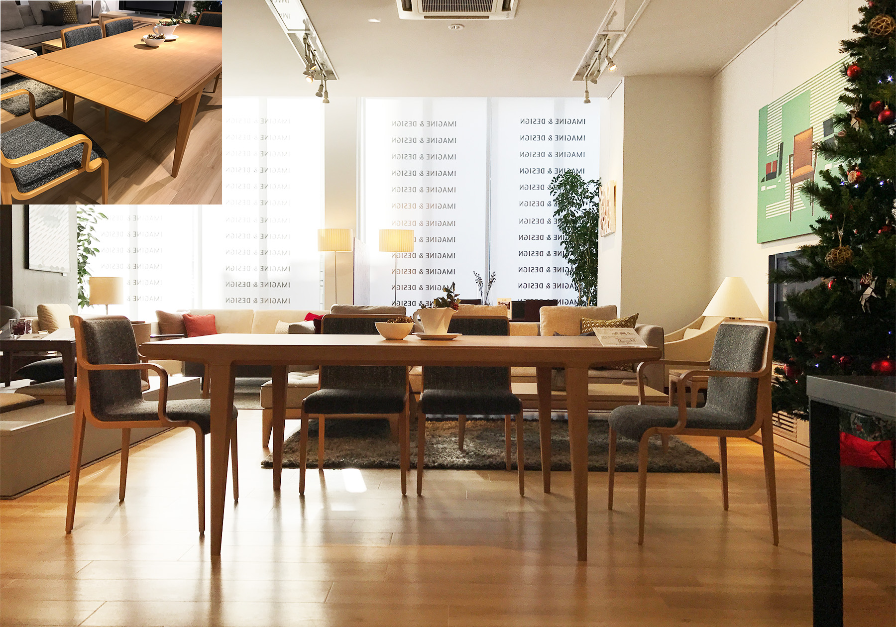 2018モデルのMD-805ソファは低くシンプルなスタイルで、1970年代のモダンなインテリアシーンをイメージしています。ダイニングテーブルMD-802はエクステンション機能を備えていますので、様々なシーンに対応します。ショールームではW1800サイズを展示していますが、両サイドを伸張するとW2300になります。来客があった場合もテーブルセッティングはそのままで、天板サイズを伸張する事が出来、非常に使いやすサイズになっています。伸張時には天板トップと平滑になり、しっかりと強度も保てます。女性でも簡単に伸張する事が出来ますので、ぜひショールームでお確かめください。また、和の空間にモダンなインテリアシーンを創りだす 座卓MD-806、座椅子MD-803も登場しました。実際に座椅子にお座り頂き、座り心地をお試し頂けます。お客様からはそのゆったりしたサイズ感やあぐ らを組んでも座卓に脚が当たらない所など大変好評を頂いています。