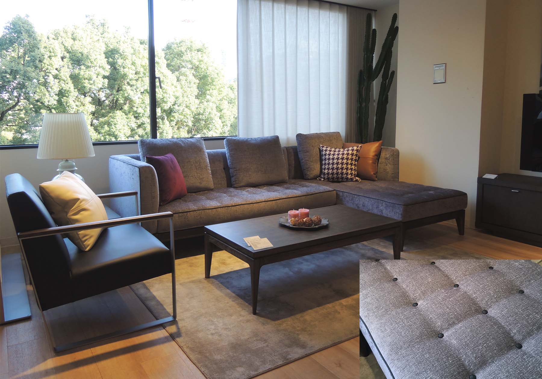 各ショールームでは、リビングとダイニングのトータルコーディネートで展示しています。売れ筋やトレンド、スタッフの意見を取り入れながら展示品を考えています。商品によって、オプションパーツを施したり住宅や建築の傾向・トレンドカラー等も加味して、お客様の参考になるように心がけています。今回加わったMD-705ソファは、根強い人気のグレー系の生地をベースに、本革ブラックのパイピング・ボタン絞りでシックでスタイリッシュなイメージに。NC-030Mコンフォートチェアは新塗装色のD-9(ヴィンテージグレー)と本革グレーのパイピングで統一感を持たせました。皆様のご要望やご意見も取り入れていきたいので、ご意見・ご要望等いつでもお聞かせ下さい。