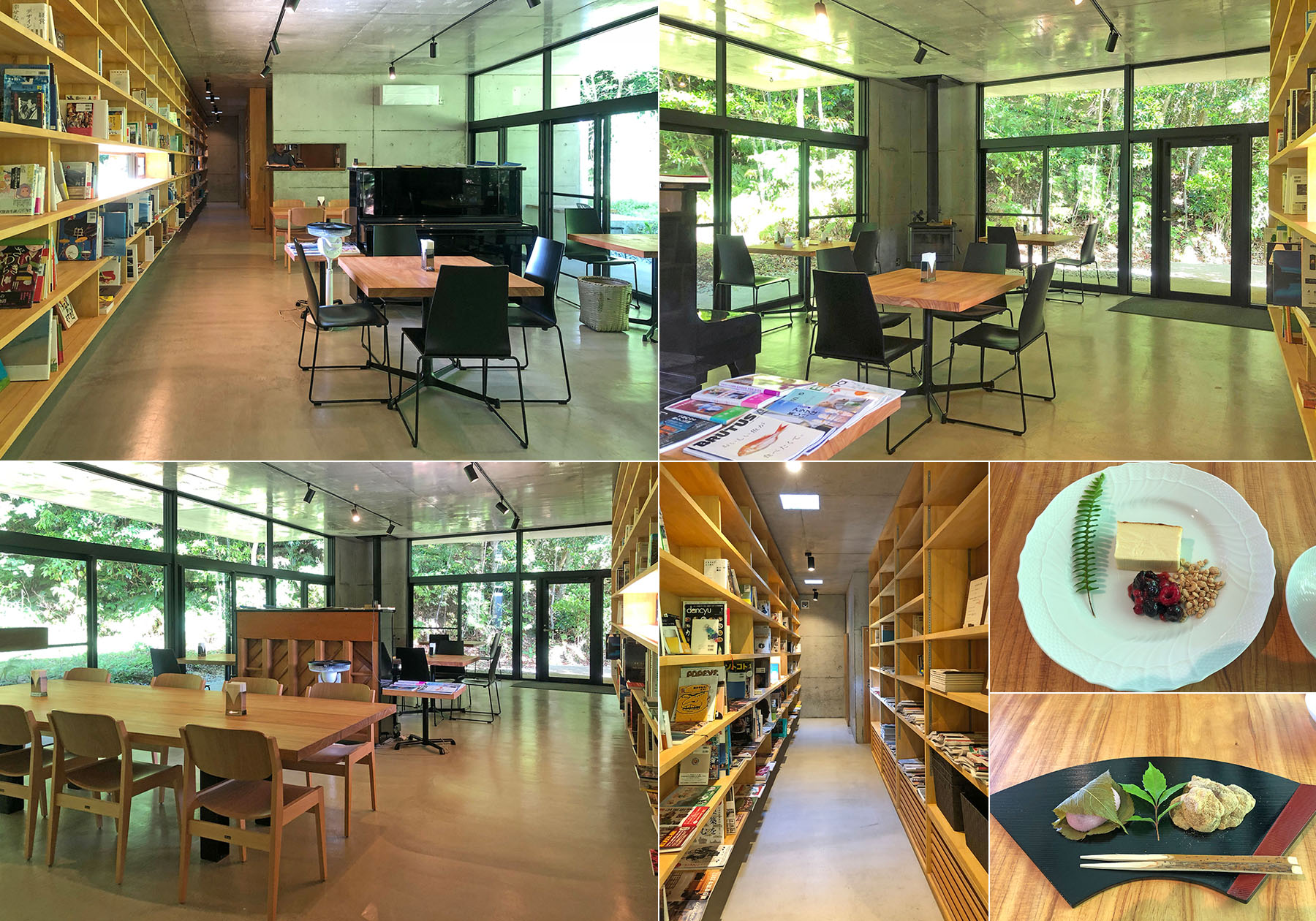 オーナーの金城さんに、訪問の訳を話してお店の事や家具の話をお聞きました。民宿をしているお父様が持っていた土地で、宿泊施設を作ろうとしたが電気も水道も無く断念した土地でしたが、今の時代になってソーラーで電気を供給でき、下水を蒸発拡散させる装置などが作れるようになりオフグリッドでもエネルギーを自活して作る事ができたそうです。それでも電線が無いので電気会社には断られ、自ら電気技師の免許を取得してソーラーパネルや蓄電池を設置したり、山の水をフィルター設置して保健所の許可を取ったり、完成まで6年かかり相当な苦労があったそうです。そのせいで料理の勉強をする事を忘れたので、良い料理は出せませんと、、でも店で出されるチーズケーキや和菓子は都内の美味しいお店に負けていません。