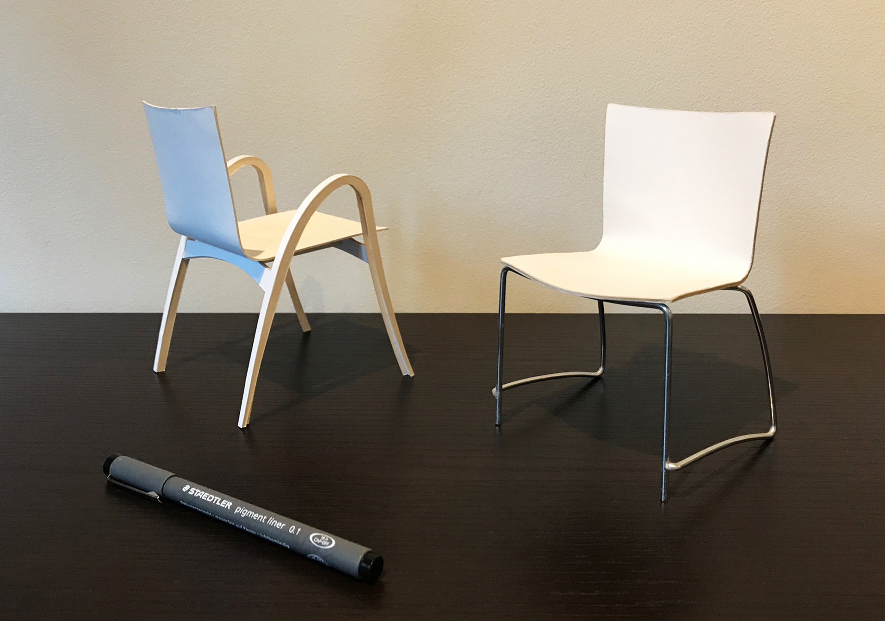 模型は、形のディテールを確認するため真っ白な紙(ケント紙やホワイトボード)で作ります。「平面の紙」から作るので、原則的に3次元の曲面は作れません。そこで立体的な3次元を表現するために工夫を凝らします。リブを付けて立体的に見せたり、成型合板と全く同じ原理でコピー用紙を重ねて接着し、椅子のシェルを製作した事もありました。5分の1スケールですが、コンマ数ミリの誤差が命取り。紙の厚みやカッターの刃の動きによって精度が変わってしまいます。昔は夜な夜な製作していた模型作り、気持ちが入ってきたときの瀬戸の集中力は凄まじいものがありました。