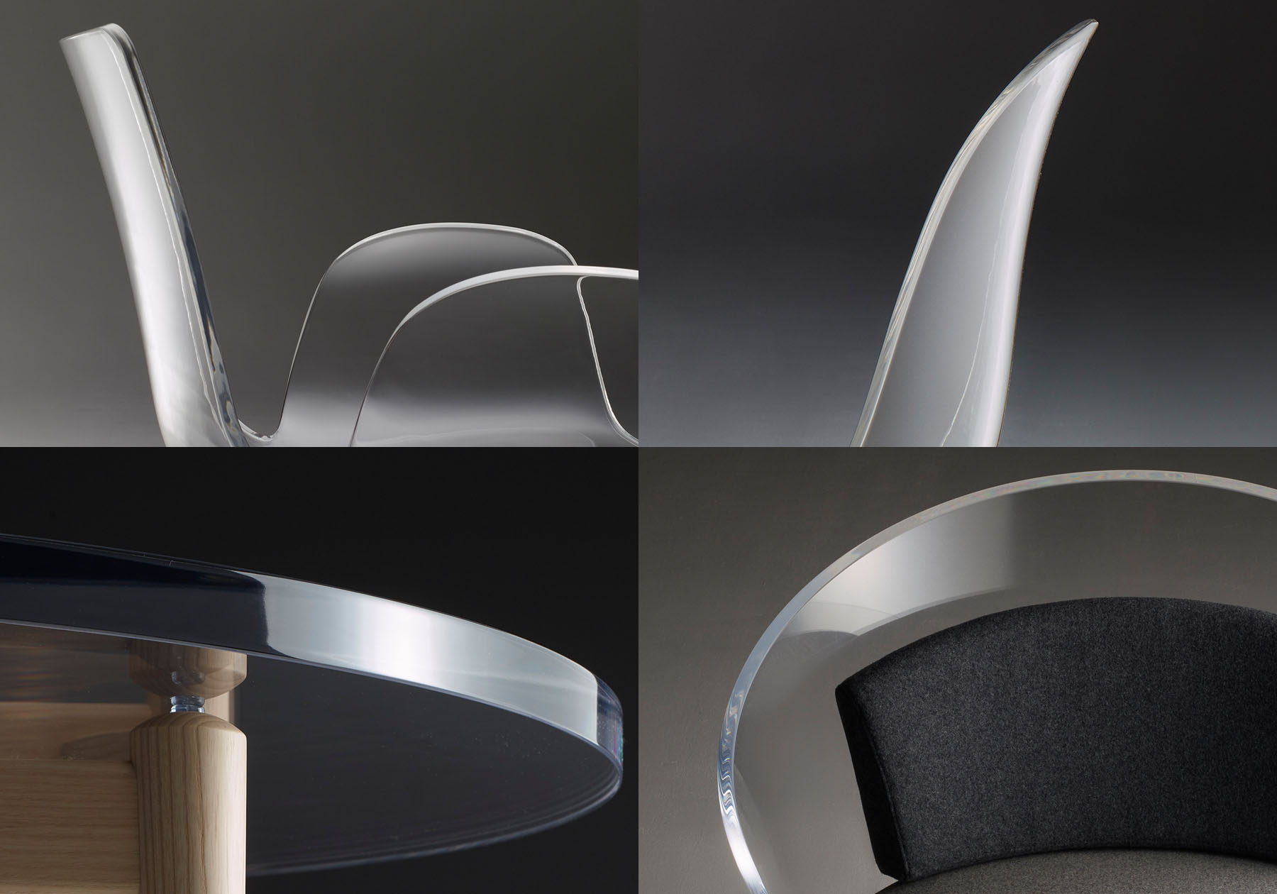 アクリル樹脂と聞いてプラスチック製としてイタリアの樹脂メーカーやイームズの樹脂素材の椅子を思い浮かべる方がほとんどだと思いますが、樹脂メーカーの多くの家具はポリカーボネート製で、イームズの樹脂は昔はグラスファイバーで今はPP樹脂で成型されます。両方ともの樹脂のペレットを使った射出成型の薄い物です。今回、当社が発表する家具はアクリル家具でも美しいキャスト方法で作られた厚いアクリル樹脂板を使用して成型した製品です。