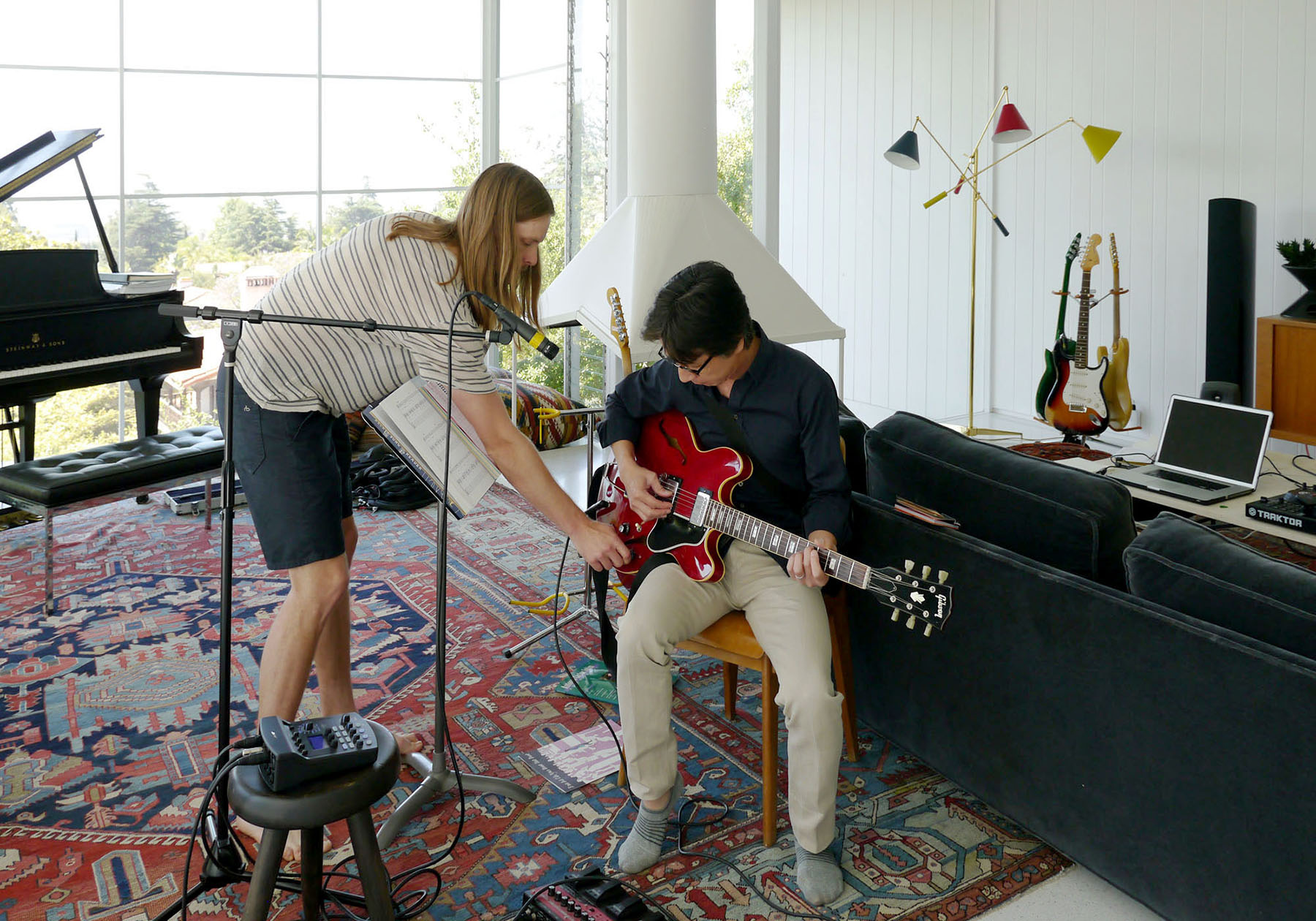 どんな方がオーナーなのか全く分からずにお伺いしたのですが、ロングヘアにTシャツ姿で快く迎えていただいたオーナーがジェームスさんでした。「マルーン5でギターを弾いてる」と言うので、その時は「腕の良いバックバンドのギタリスト?」と勘違いしていました。ジェームスさんはセレブにありがちな気難しさが微塵もなく、散らかってるけど自由に見て、と、寝室まで見せていただきました。所々に置かれているギターのケースにはモデル名と年式が書かれているのですが、どれも貴重なヴィンテージ!!しげしげと見ていると「見るかい?」と、ケースを開けて見せてくれるではありませんか。しかもそんな貴重なギターをアンプに繋いで「弾いてみなよ!」と弾かせてもらえたんです。