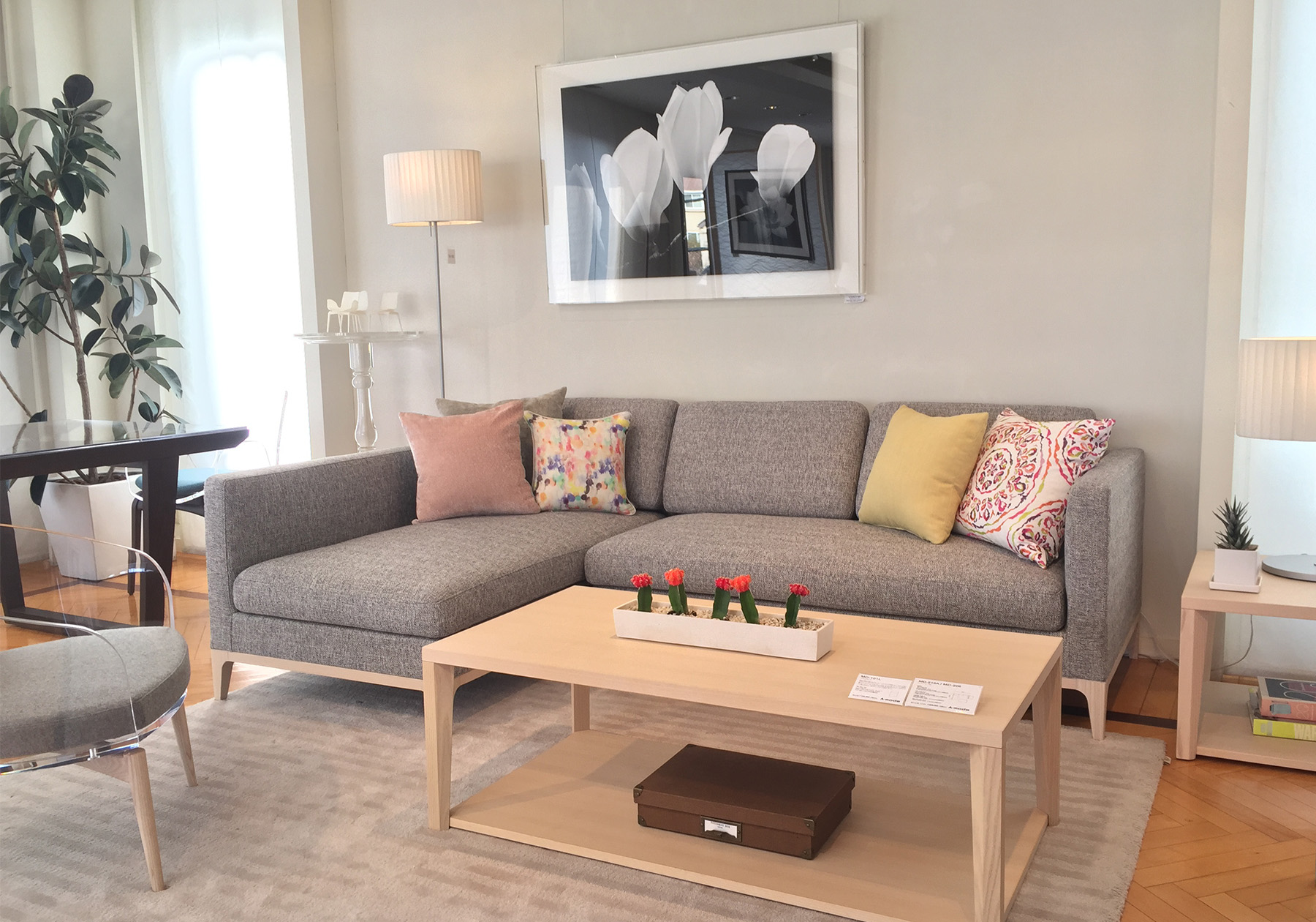 ショールームではインテリアのコーディネートはもちろん、皆様のライフスタイルのアイディアとなるようにご提案しております。春色になったショールームで、春のインテリアやファッションのイメージを膨らませてみてはいかがでしょうか? ご来場をお待ちしております。(ショールーム担当:西條 恵理)