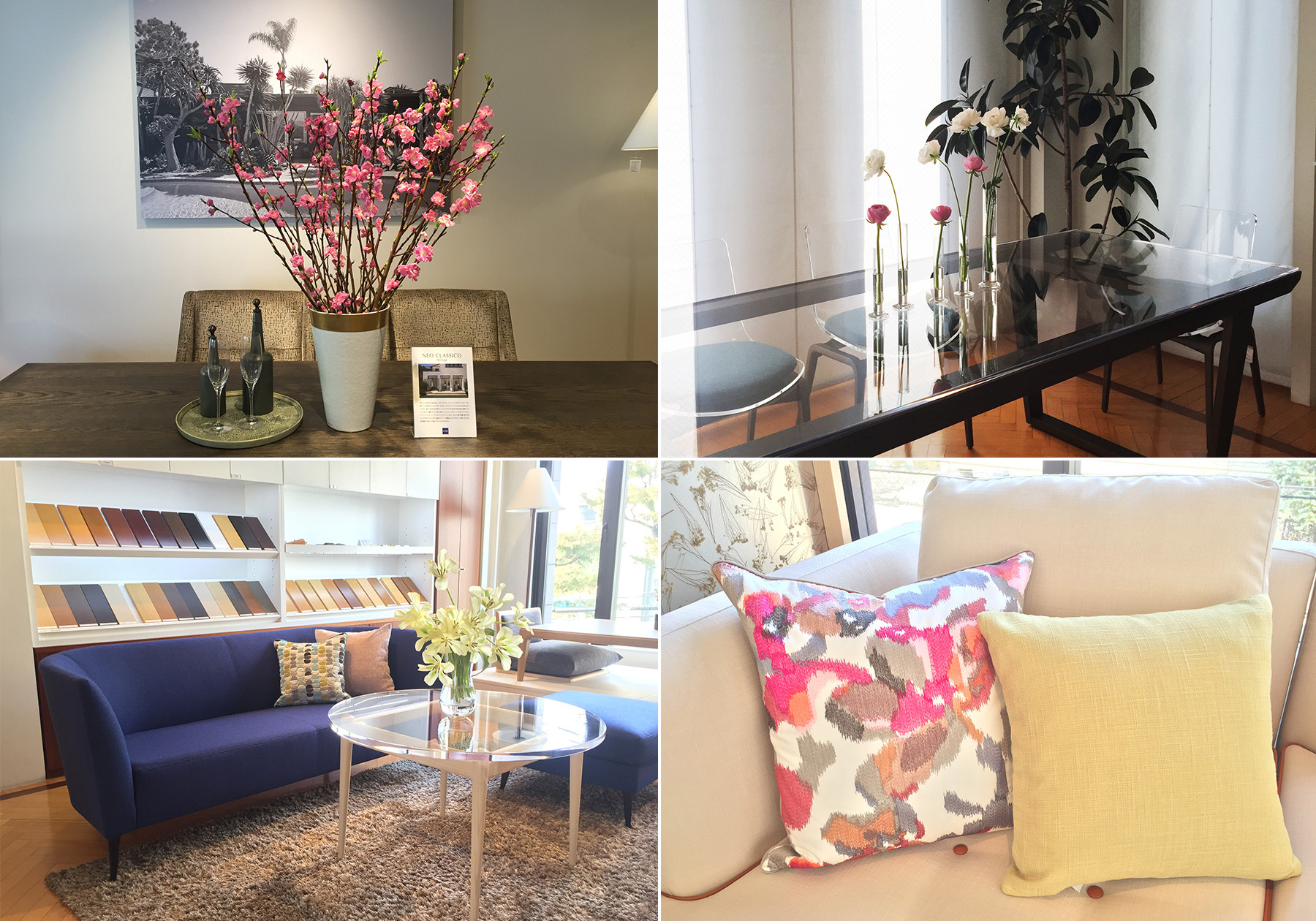 今年の春は暖色系がトレンドですね。春を代表するピンクやイエローに加えてグリーンも人気のようです。ショールームのディスプレイもトレンドや季節感を取り入れながら、デコレーションしています。季節でお部屋のインテリアを替えたいと思っても、カーテンやソファカバーを替えるのは大掛かりになります。手軽に取り入れていただくアイテムとして、クッションがお勧めです。素材やカラー、柄、風合いなどとても豊富ですし、空間のアクセントにもなりますので気軽に楽しめます。季節のお花などを飾ると更に華やかになり、季節感がアップします。ご自宅でも、お客様がいらっしゃるリビングやエントランスに季節感を取り入れるとおもてなしにもなりますね。ショールームではピンクやイエローのクッションに、花柄の刺繍のクッションをプラスして華やかにコーディネートしました。ひな祭りが近いので、メインダイニングには大きめの花器に桃の花を飾りました。フラワーベースにまとめてお花を入れると豪華になりますが、一輪挿しを複数飾るとリズム感が出て軽やかな印象になります。また、ソファやチェアの色と反対色のお花を飾るとコントラストがついて、引き締まった空間になります。春はたくさんのお花が溢れていますので、日々の生活も彩られますね。