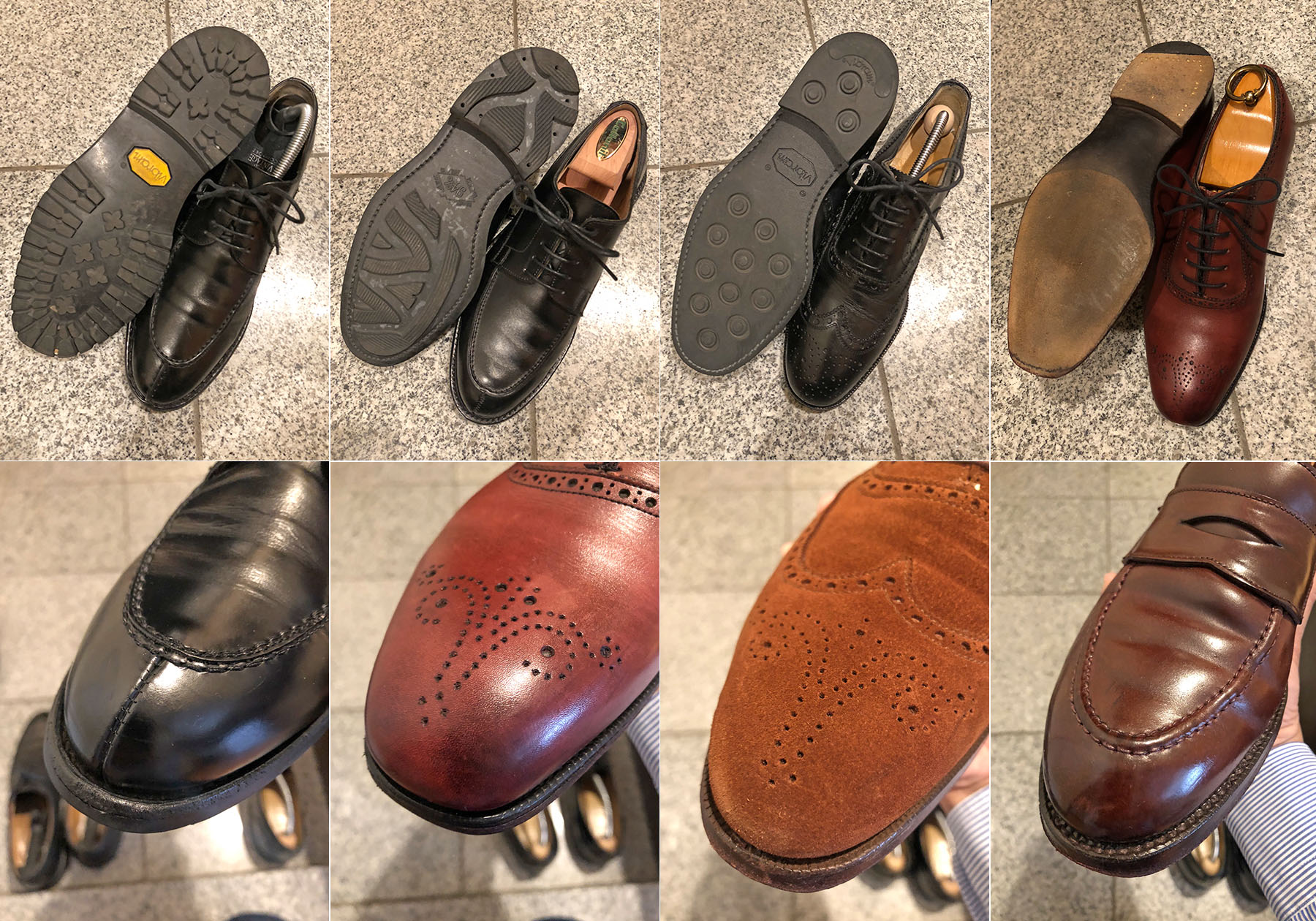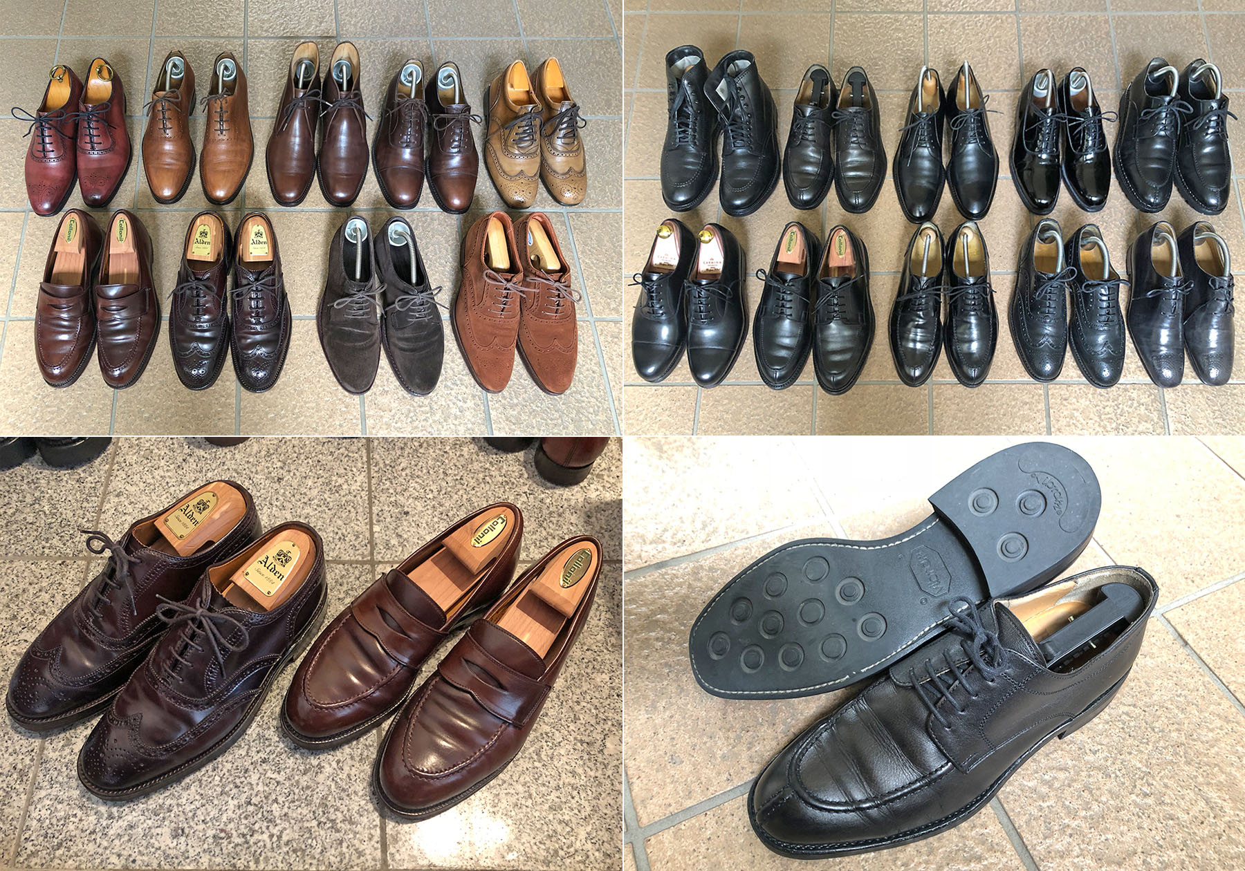 社員からはマニアと言われますが、1年か2年に1回購入して、大切に使ってようやくこの数に、、。どれもオーソドックスな定番デザインです。自分のデザインテイストと同じです。靴を磨きながら廃盤にならないデザインってこんな感じなんかなと再認識しました。秋の新作に向けて新作をデザインを始めています。お楽しみに。