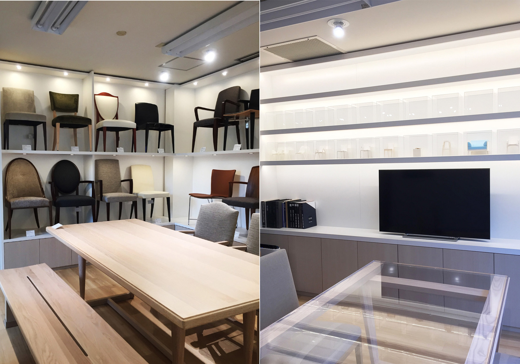 ショールーム2階は単品椅子をメインに展示をしています。その展示棚が新しくなり棚下に照明を付けましたので、明るく見やすくなりました。奥の打ち合わせスペースには壁面収納が付き、棚には製品開発時に製作した1/5スケールの模型を展示しています。ご来場いただいたお客様にも、図面だけではなく模型を製作し立体的にフォルムをチェックしている当社のモノづくりの一部を垣間見て頂けると思います。実物と模型を見比べて頂くこともできますね。ショールーム3階は窓のシェードを新しくしました。シングルシェードからダブルシェードにし、ミラーレースと遮光ドレープの機能性をもたせました。近頃はカーテンの機能性も豊富です。特にリビングは大型の窓が多くなっていますし、ソファと窓が近い距離にありますので、カーテンのスタイルも重要です。家具のレイアウトやライフスタイルに合わせてアドバイスさせていただきますので、家具選びと一緒にお気軽にご相談ください。