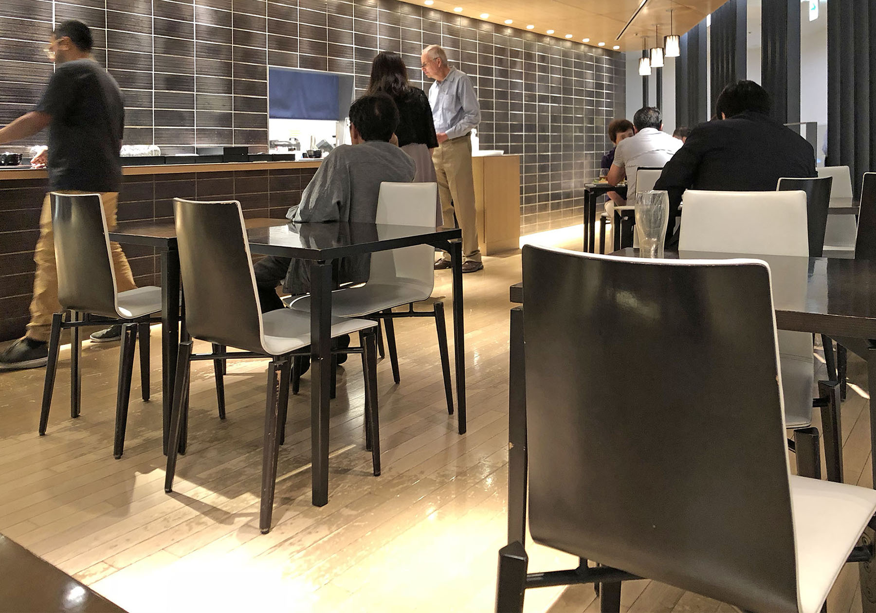海外へ出発するときに、ありがたいお蕎麦のコーナーで使われているのは、成田空港用にオリジナルのアレンジを施した特注仕様のAD-961A チェルボ デゥエ。製品化されてから20年以上になるロングセラー商品です。納品したのが2006年の5月ですから、なんと13年の長きにわたって空港ラウンジのヘビーユースに耐えてきたことになります。手前味噌ながら改めてその耐久性と強度に自信を持ちました。もちろん、大切にお使いいただいているからだということはいうまでもありません。