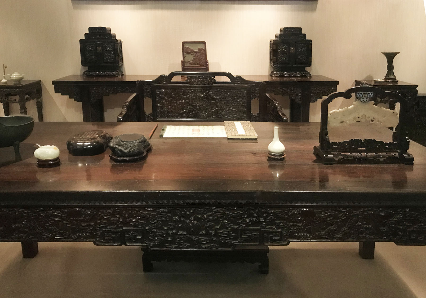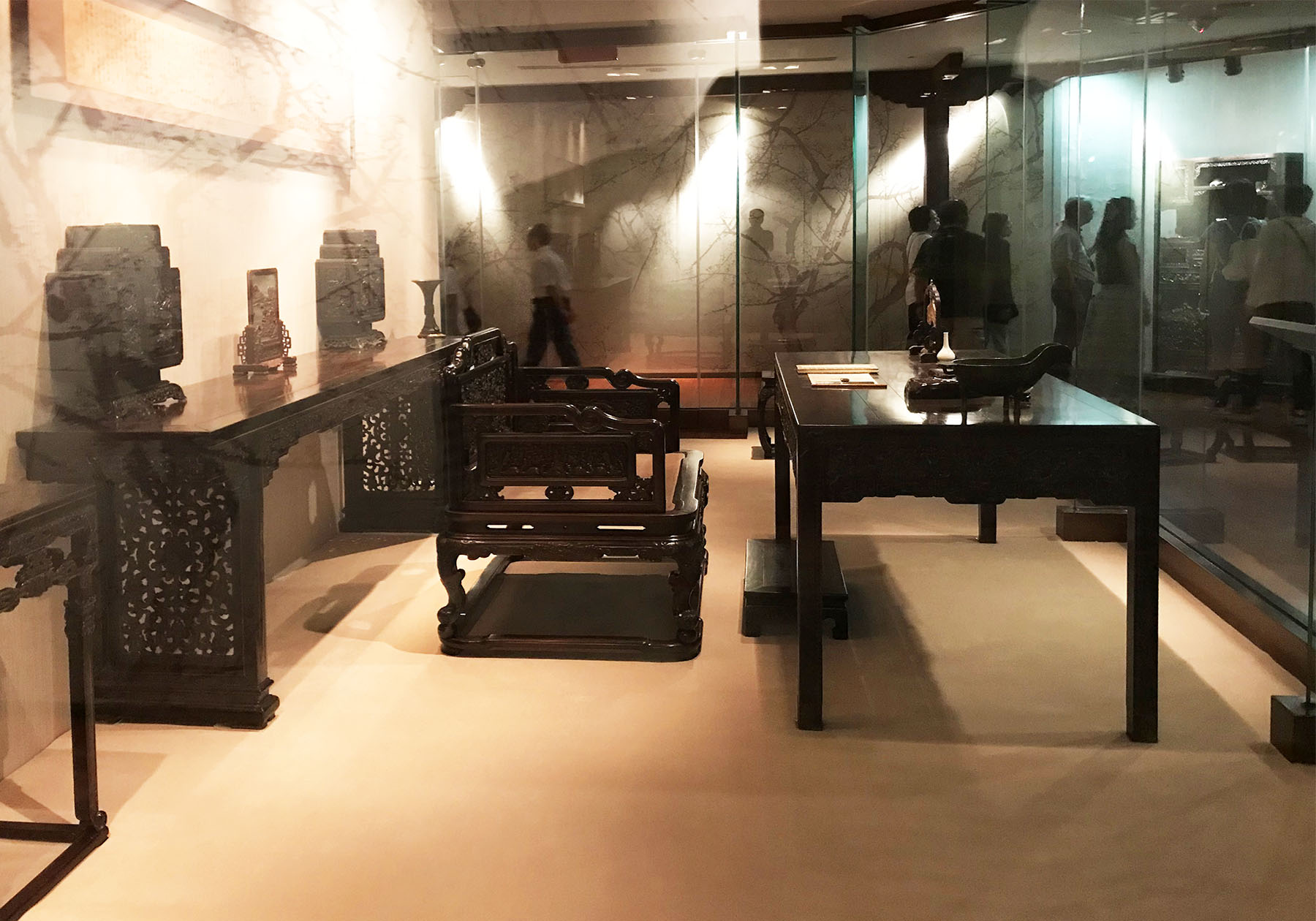 昔から紫檀は高価で貴重な木材でしたが、展示されている17世紀からの膨大な紫檀の家具はもはや永遠に制作不可能な圧倒的な品々でした。展示の家具は恭親王府に置かれていたものだそうですが、製作されていた時期は17〜19世紀と幅があり、セットで制作されたものではないため、いくつかの様式を組み合わせながら、現代のインテリアにも通じるミックススタイルで展示してありました。紫檀特有の重厚できめ細かな木理を活かした豪華で複雑な美しさを備えた家具に圧倒されます。超絶彫刻を施した家具は、ガラスケースの中に収めてあり、その貴重さがひときわ際立っていました。