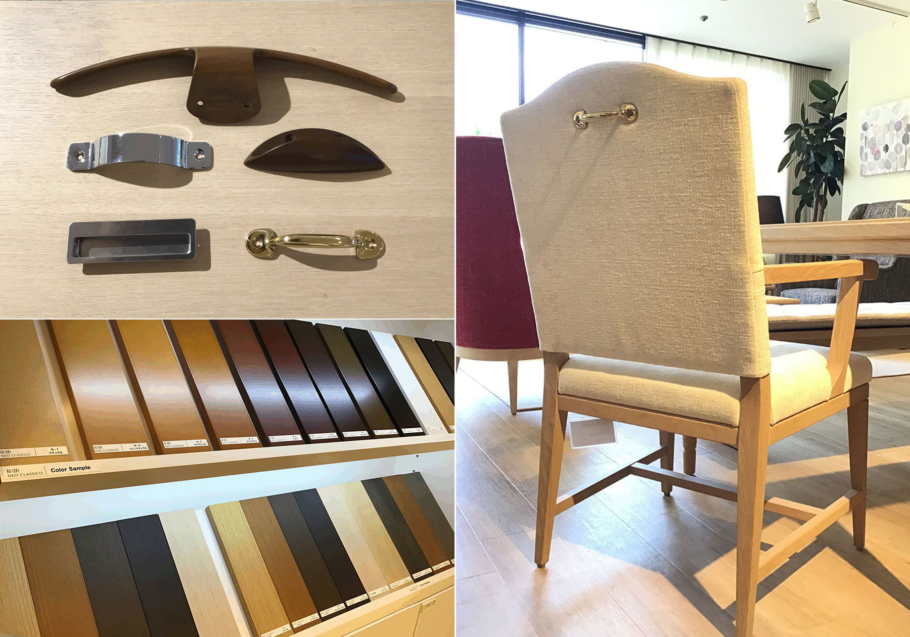 ショールームでお打合せの際は、お好きなインテリアスタイルやお部屋の雰囲気が分かる写真等をお見せいただければ、イメージに合わせてコーディネートさせていただきます。木部の塗装色は、お部屋の床や壁などのテイストに合わせられる様に全22色ご用意しています。A-mode・PMMA+Woodは5色、AD CORE・NEO DLASSICOは13色、Heritageシリーズは9色とブランドごとに色をお選びいただけます。木本来の色を生かしたナチュラル色やダーク色、Heritageシリーズには人気のヴィンテージ色をお選びいただくことができます。お部屋の家具の塗装色やファブリックを同じ配色にすることで、インテリアに統一感が生まれます。また、ソファに施すパイピングをオプションで本革に変更できる製品もあります。本革にすることで製品自体が引き締まり、高級感も出て大変ご好評です。また、ハンドルを付けることが可能なチェアもあります。後ろ姿のアクセントにもなり、機能的にはチェアの移動がスムーズになり、お掃除の際にとても便利です。