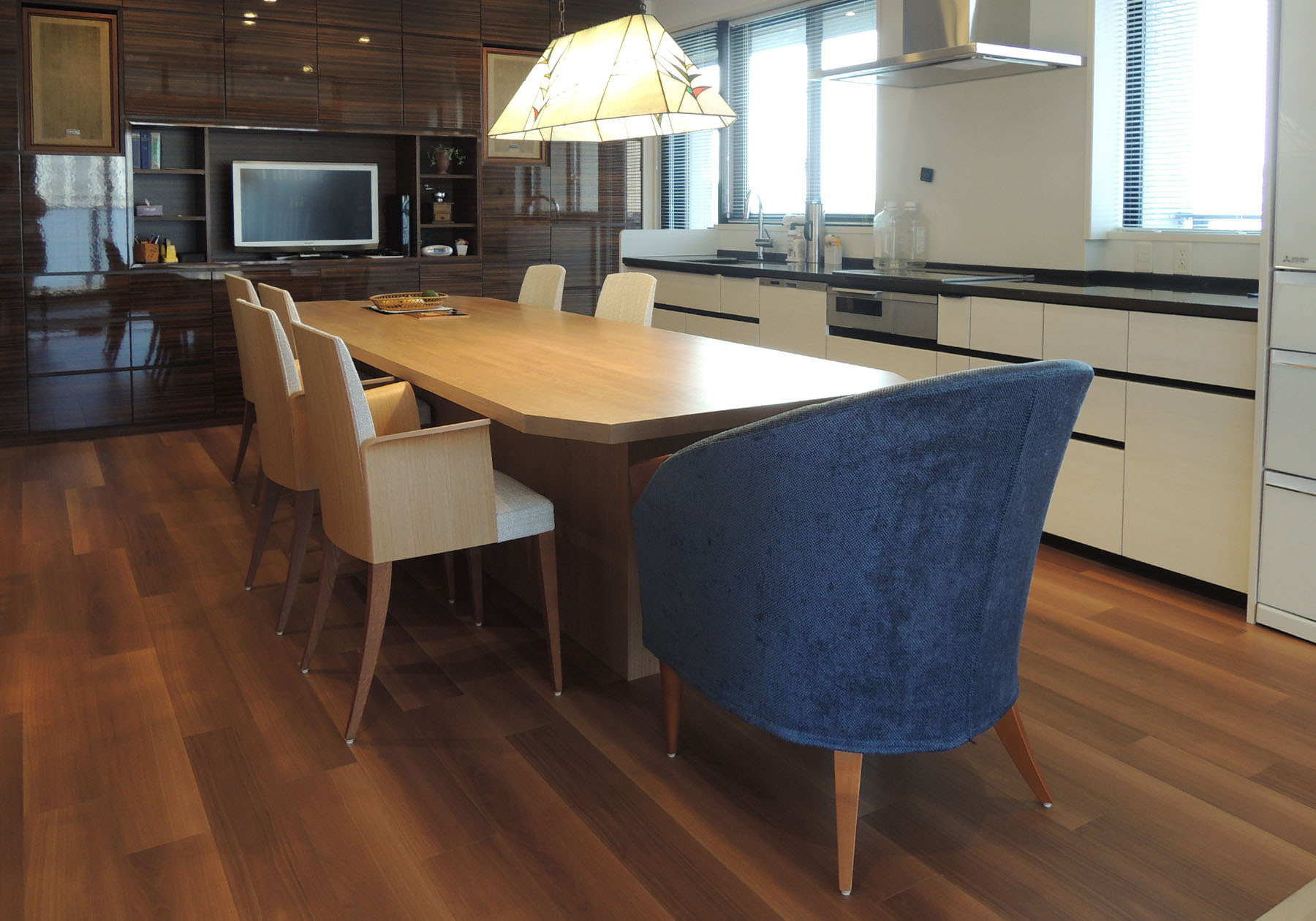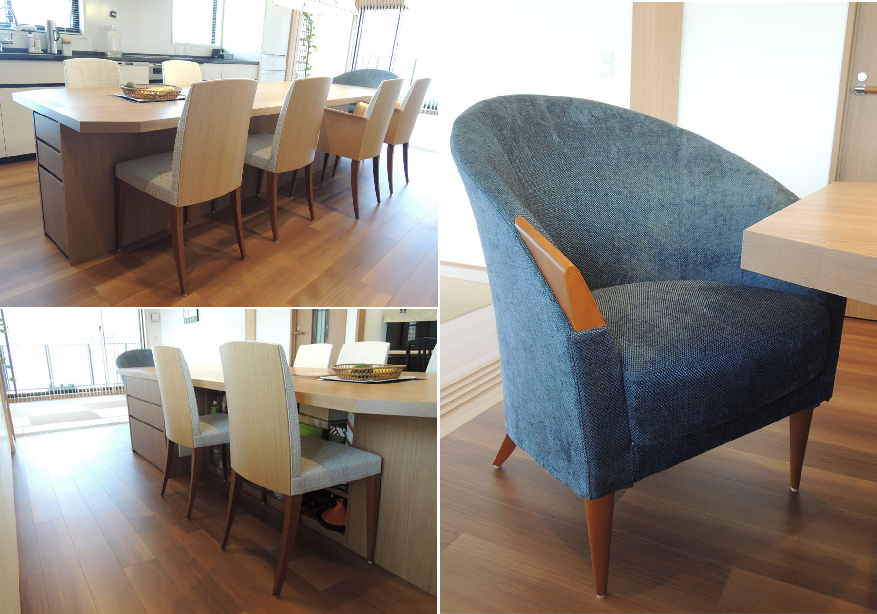今回、ご自宅を建てられるのは3度目で、今まで建てられたご自宅との繋がりをとても大切にされ、お客様の思い出とこだわりがたくさん詰まった大切な空間に仕上がっています。以前のお宅からご使用されている照明の形に合わせて製作したダイニングテーブルに、AD COREブランドのLUSSOとFESTA GRANDEをお選びいただきました。LUSSOの背の部分は、テーブルの天板と色を合わせ、脚は床になじむ濃いブラウンをお選びいただきました。ブラウンを基調にしたダイニングにFESTA GRANDEのブルーのファブリックがよく映え、とても素敵な空間となっています。どちらもテーブルに高さを合わせる為に座面の高さを特注しています。ご自宅を建てられるのもこれが最後になるとのことで、機能やインテリアを何度もコーディネーターの方とお打ち合わせをし、大変満足いく空間が出来たと喜ばれていました。こだわりの空間にエーディコア・ディバイズの家具をお選びいただき、とても嬉しく思います。