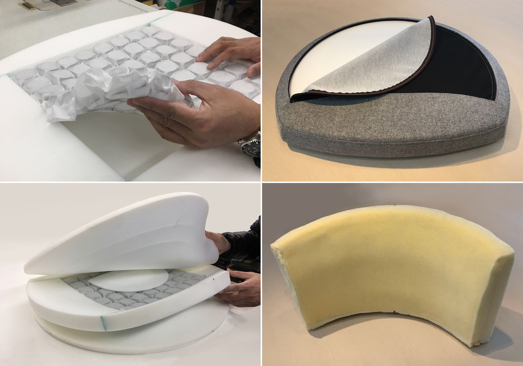 座面にセットされるクッションは、軽やかに見えるように90ミリと薄い作りですが、内部には厚み約35ミリの特殊なポケットコイルをインサートし、体圧を分散させる柔らかな掛け心地と耐久性を併せ持ちます。クッションはカバーリングになっており、取り替えが可能で、裏面には滑り止め効果のある張地を張ることで使用中にずれることがありません。背のクッションはシェルの背のカーブに沿うように三次曲面を持つウレタンに立体縫製のカバーを取り付けています。