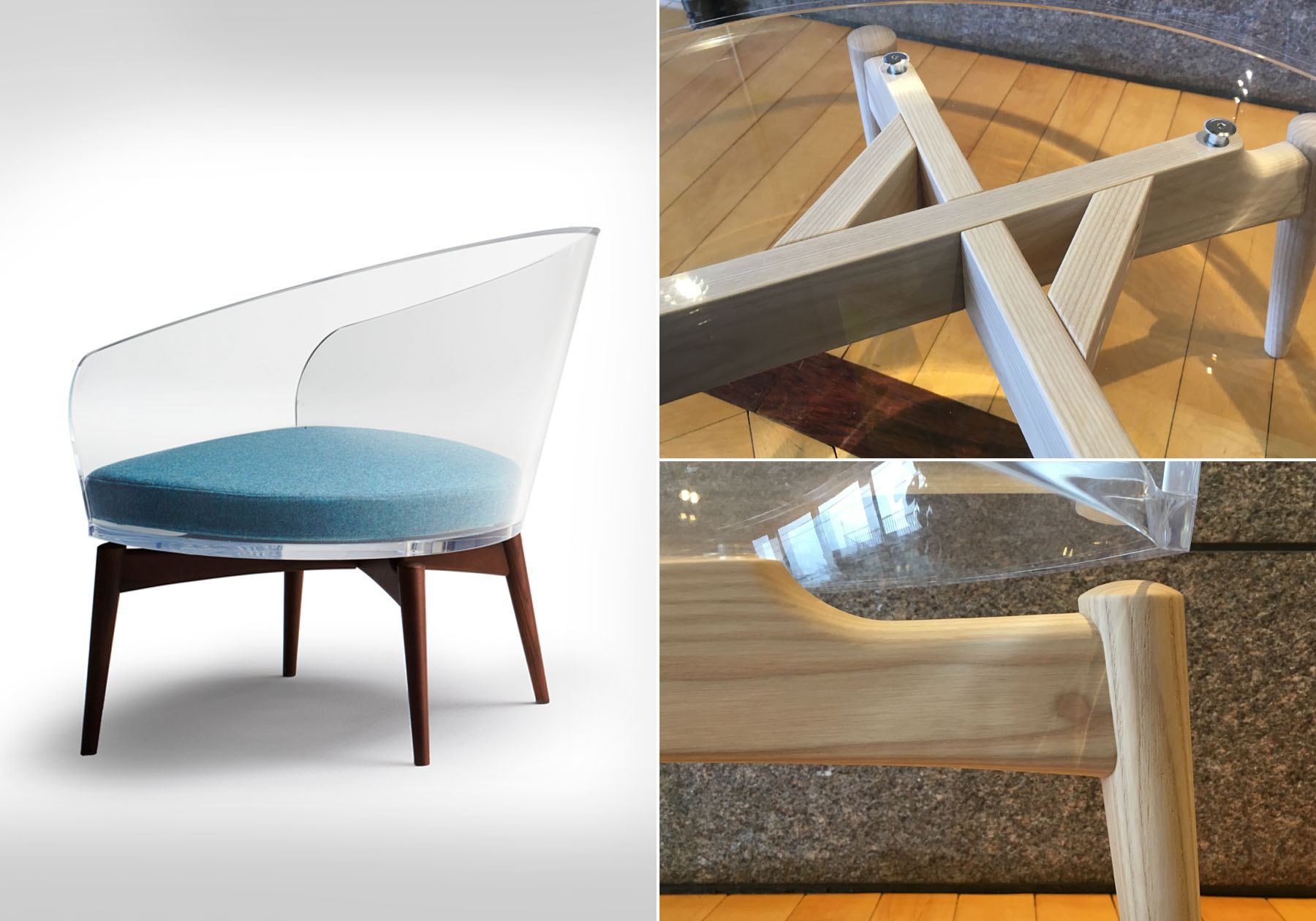 アクリル樹脂と木部の組み合わせが新鮮な印象のラウンジチェアPLUM、高度なアクリルの樹脂の成型技術と木部の加工技術が組み合わされて出来上がりました。透明なシェルは空間を広く見せ、洗練された存在感のあるデザインです。ポケットコイルを使用した座クッションが上質な掛け心地が生み出します。