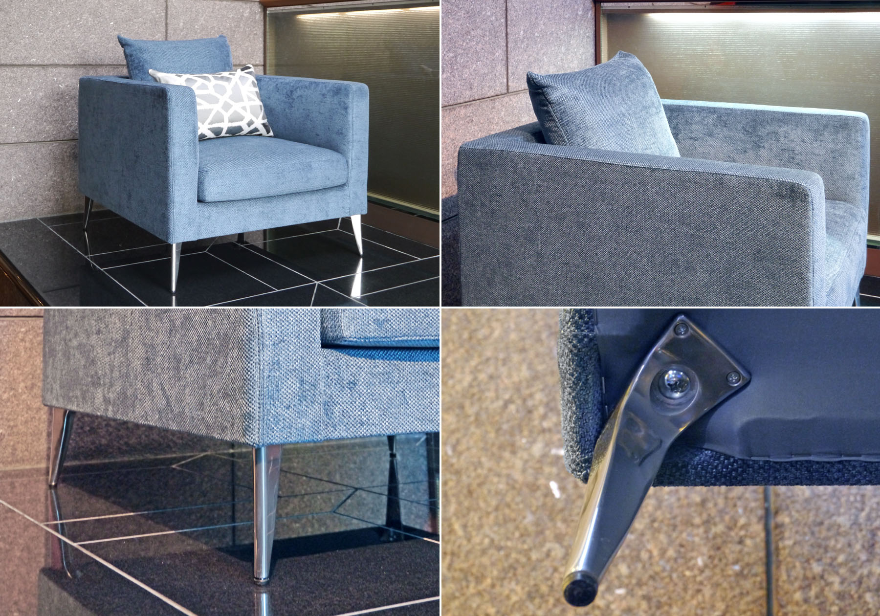 Bタイプの脚パーツはシャープな印象のアルミダイキャスト製で、シルバー、鏡面仕上げのブラックの二色からお選びいただけます。柔らかなクッションは中材に羽毛とポリ綿を使用し、シャープな脚部との組み合わせでクラシカルモダンな空気感を演出しています。