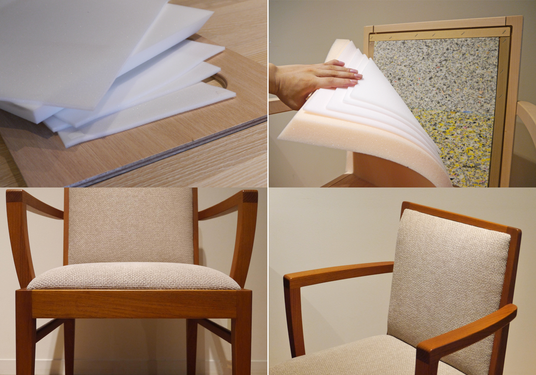 シャープなフォルムのフレームと対照的な丸みのある座クッションは、座枠に張られた布バネに薄いウレタンを重ね、さらに厚み40ミリのウレタンを被せるように重ねて、合計5層のウレタンを使用しています。厚みのあるクッションは腰掛けた際に深い掛け心地をもたらします。6層のウレタンを重ねて作られた背のクッションも、座と同様に厚みがあり、固めのチップウレタンをベースに厚みの異なるウレタンを重ね、丸みのあるフォルムになっています。腰と背をしっかりと支え、安心して身を預けられるようになっています。