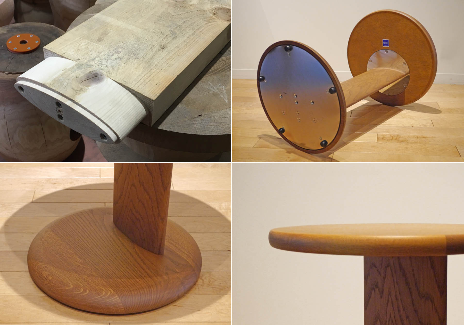 MD-807の特徴は柔らかなディティールです。オークの無垢材で縁取られた天板の木口は、楕円を分割した曲線で面取りを施し、優しい手触りを感じて頂けます。一本脚から四本脚まで共通の脚は、厚み50mmのオークの無垢材の一枚板を断面が楕円になるように削り出し、スチールプレートを用いてしっかりと天板に固定されています。断面形状を楕円にすることで見る角度によって様々な表情を見せるテーブルになりました。一本脚のBHタイプのベース部分も無垢のオーク材を削り出し、楕円をモチーフに優しい面取りを施してあり、当たりが柔らかいデザインです。スチールプレートを組み合わせた重量のあるベースにより簡単に倒れないように作られています。
