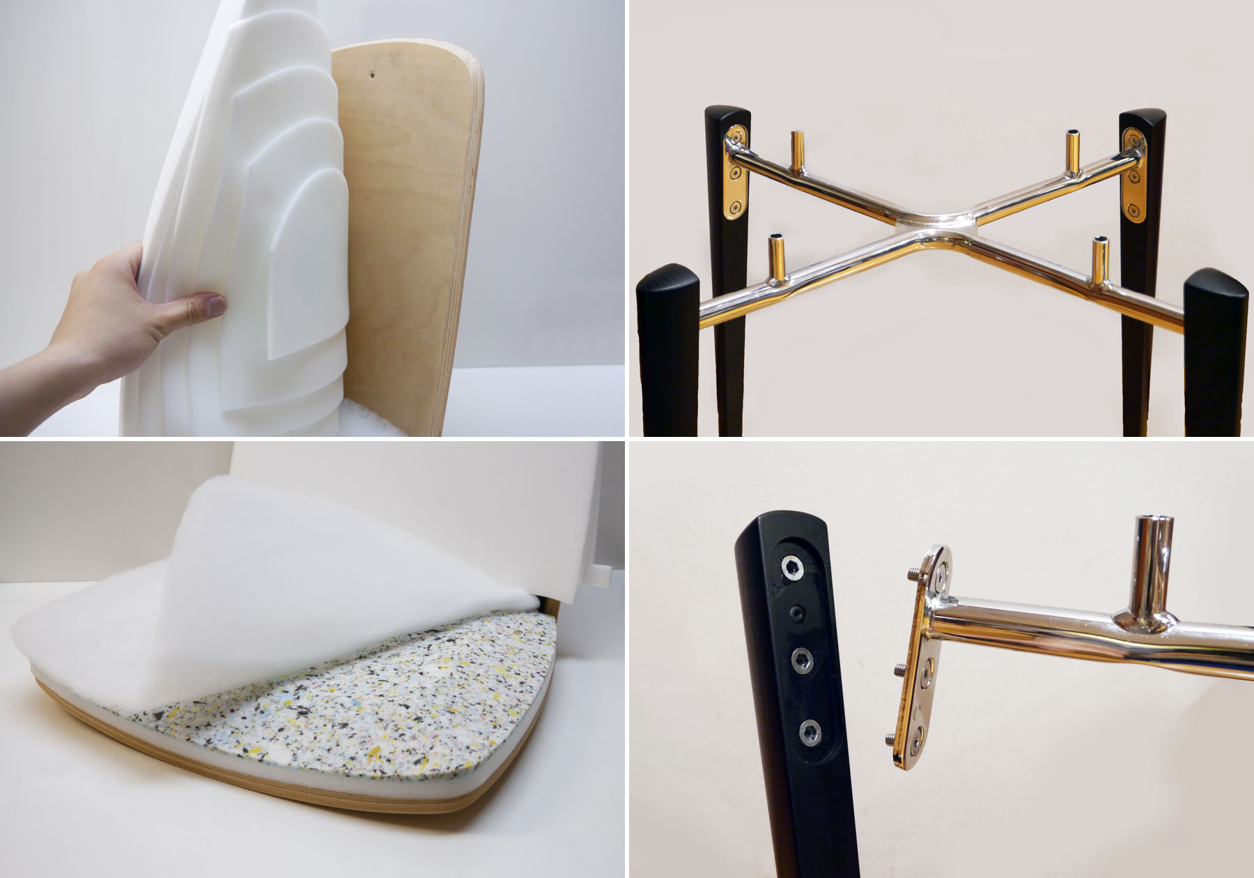 成型合板の背座は、スチールのL字金物を5個用いて接続されています。この金物は表面に見えませんが、強靭でしなやか、体重をかけると背がわずかにしなることで掛け心地を良くする機能を担っています。アームチェアは成型合板の背のシェルがアームまで囲まれるような構成で、アーム部分を分割することなく一体で成型されています。長年積み重ねた成型合板の高い技術によって実現されました。座面もよりゆったりとした掛け心地になるよう、固さと厚みの異なるウレタンを3層に重ね、背は大きさの異なる5層のウレタンがしっかりと身体を支えます。
