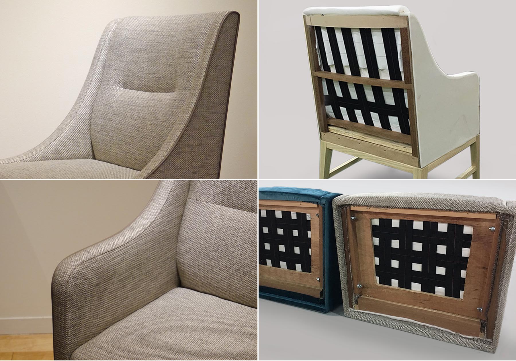 座と背のクッションのベースには弾性ベルトをクロスに編んで使用し、深く柔らかな掛け心地を実現しました。背クッションの弾性ベルトは腰部と背の上部とで異なるものを使用し、腰は固めに背は柔らかめにすることで掛け心地を良くしています。更に、厚みのある背のクッションには絞りを入れることで、柔らかなだけでなくしっかりと腰をサポートし、身体に負担をかけない快適な掛け心地です。