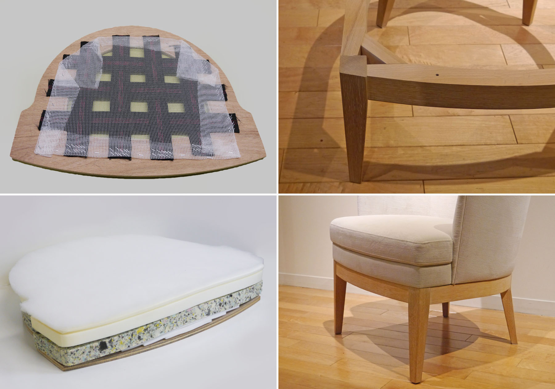 美しいカーブを描く背からアームが一体のシェルは成型合板でできています。そして身体を支える背のクッション部分には様々な工夫が施してあります。まず、背のシェルに硬さの異なる厚いウレタンを貼り付け、その上に弾力のあるメッシュをカーブしたシェルに沿わせ張り込みます。これが自然なカーブを作り出し、シェルに厚みを持たせます。さらにメッシュの上にも厚み硬さの異なるウレタンを貼り付け美しいラインを作り出しながらしっかりと身体を任せられるかけ心地に仕上げました。背中の2つのボタン絞りはデザインのアクセントだけではなく、背にわずかな角度の変化を作り出し、腰を支えるという機能も兼ね備えています。座面は弾性ベルトを張ったフレームに、厚みと硬さの異なるウレタンを6層に重ねてできています。これにより柔らかさとしっかりさを兼ね備えたソファのようなかけ心地を実現しました。フレームはシェルのカーブに沿う形状に無垢材を削り出し、ホワイトオークの脚と一体になります。