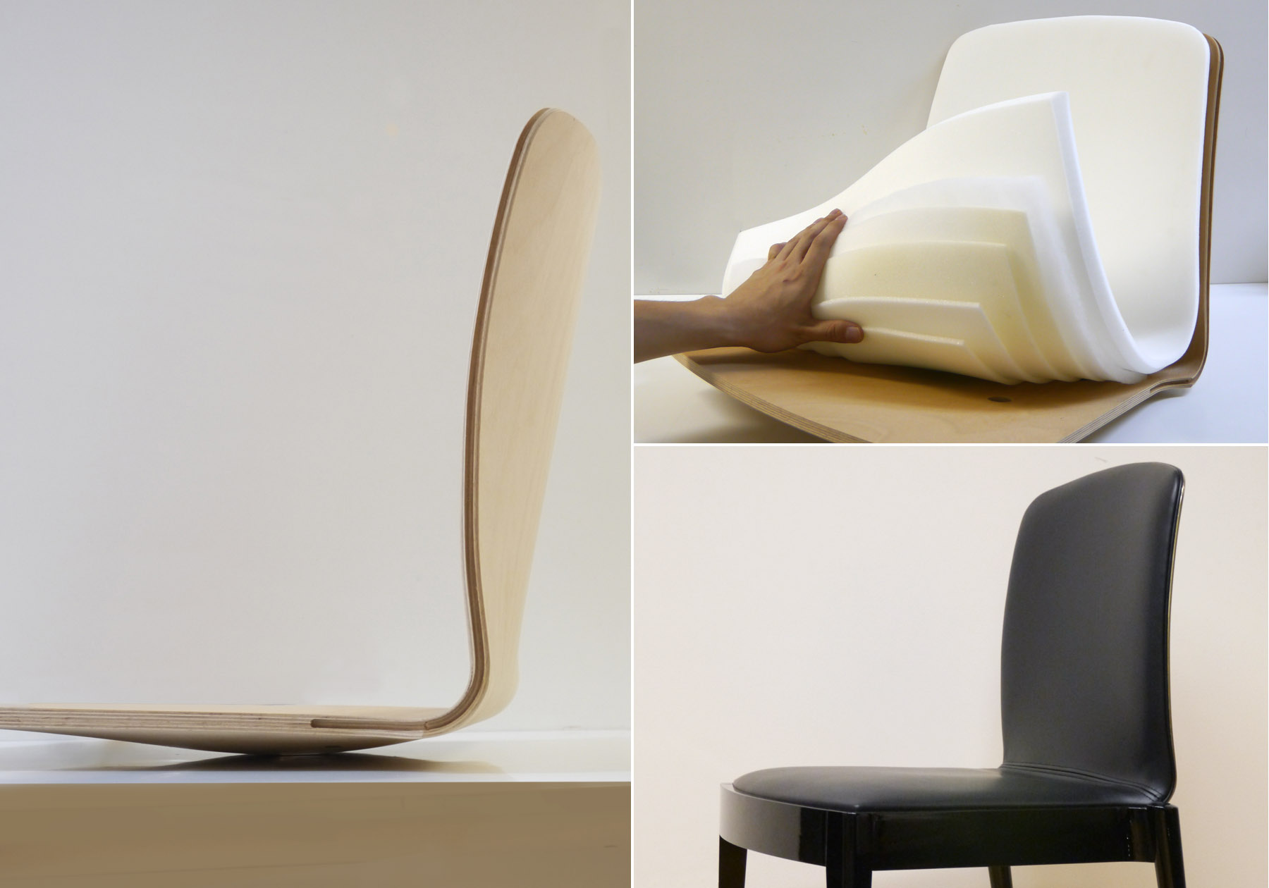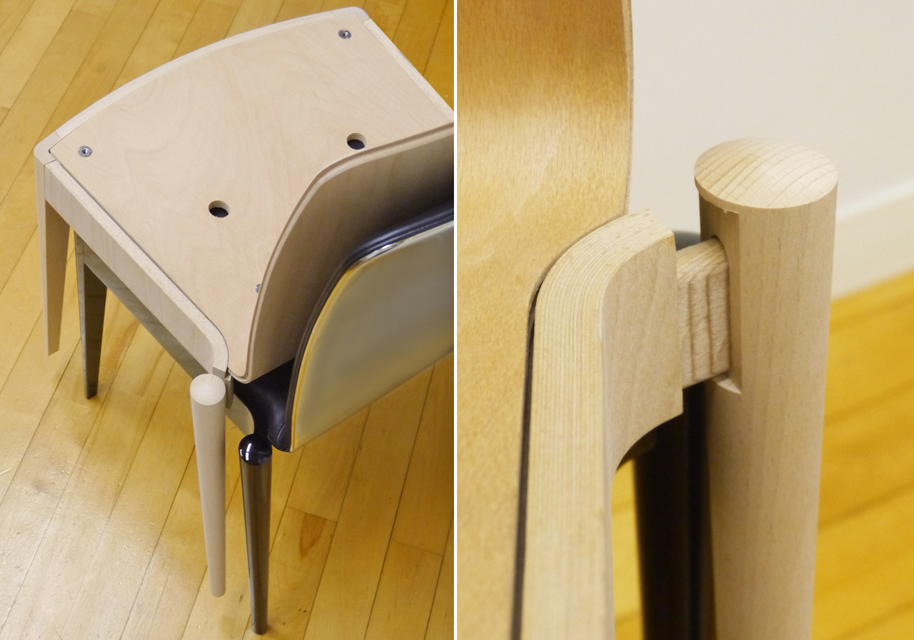 独創的な構造を持つCAMBIAは、背座にはエーディコアが得意とする3次曲面の成形合板、曲線の主要フレームには成形合板を使用。無垢材は直線の脚部にのみ使用し、パーツを削り出す際に出る無駄な材をできるだけ減らした、環境資源に配慮した構造です。成型合板で作られたフレームは美しいカーブを描き、無垢材を削り出して作られた脚に精度の高い加工をされた仕口で繋がります。この加工によりシャープなデザインを崩さずに、スタッキングできる構造になっています。3次曲面の成形合板がベースの座面は、一見フラットに見えますが、シェルの中央にすり鉢状に20mmのくぼみを持たせ、6層のウレタンを重ねることで、見た目からは想像できないほど上質な掛け心地に仕上げてあります。また、高度な加工技術によって実現した、厚み10mmの背板の木口に溝加工し、パイピングで張地を収めることで、シャープなフォルムで座面と背面のコントラストを引き立たせる、美しい仕上がりになっています。