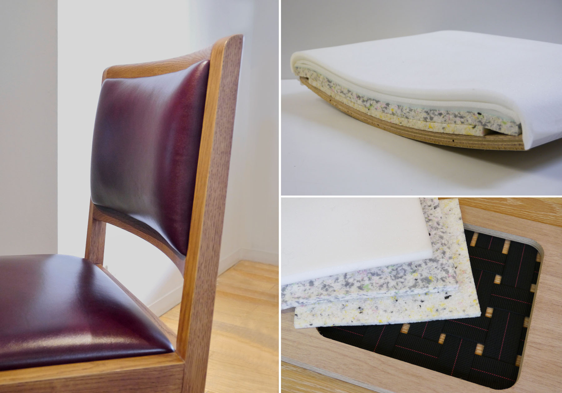 MD-103Nは直線的でスクエアな構成のMD-103の特徴をそのままに、新しさと懐かしさの同居するヴィンテージスタイルにアレンジしました。素材は木目の表情が豊かなオーク材に、木部のカラーリングは新色のヴィンテージブラウンを加えた8色からお選び頂けるようになりました。端部の面取りも大きめに変更し、手触りでも木材の柔らかさを感じて頂けるようにデザインしました。そしてMD-103Nを特徴付けているのは滑らかなカーブを描くアーム。触れたくなるような削り出しの曲線を描くアームは、肘を置くスペースがしっかりと確保され、身体を安心して預けられます。従来のMD-103に比べ奥行きを40mm広げ550mmに、サイドチェアはワイドを20mm広く取り470mmになりました。さらに背のクッションもMD-103に比べ厚くする事で深く腰掛けることができ、ダイニングシーンでもよりゆったりとした時間をお過ごし頂けます。座クッションの構成は、弾性ベルトと厚み、固さの異なる3種のウレタンを使用し、柔らかくなりすぎず、張りのある座り心地です。