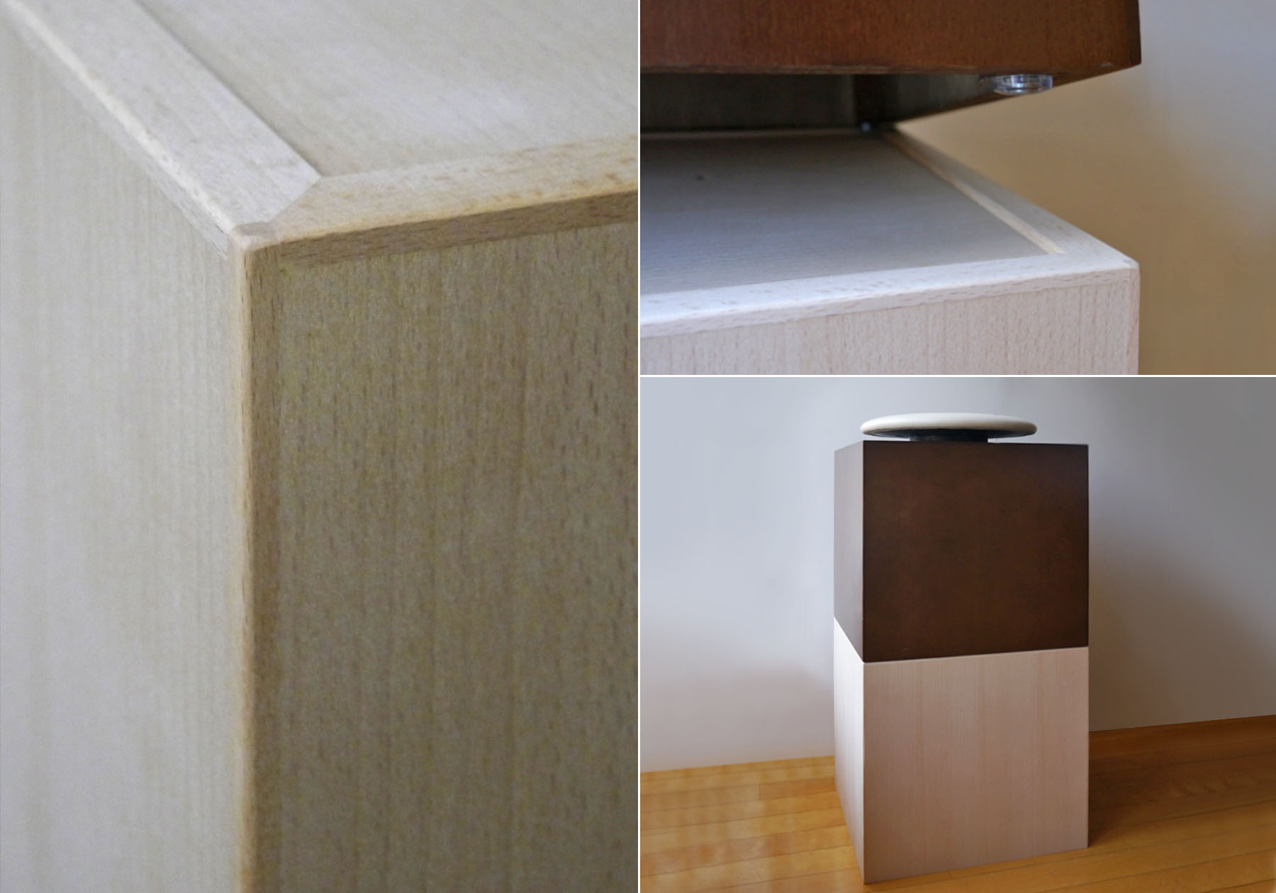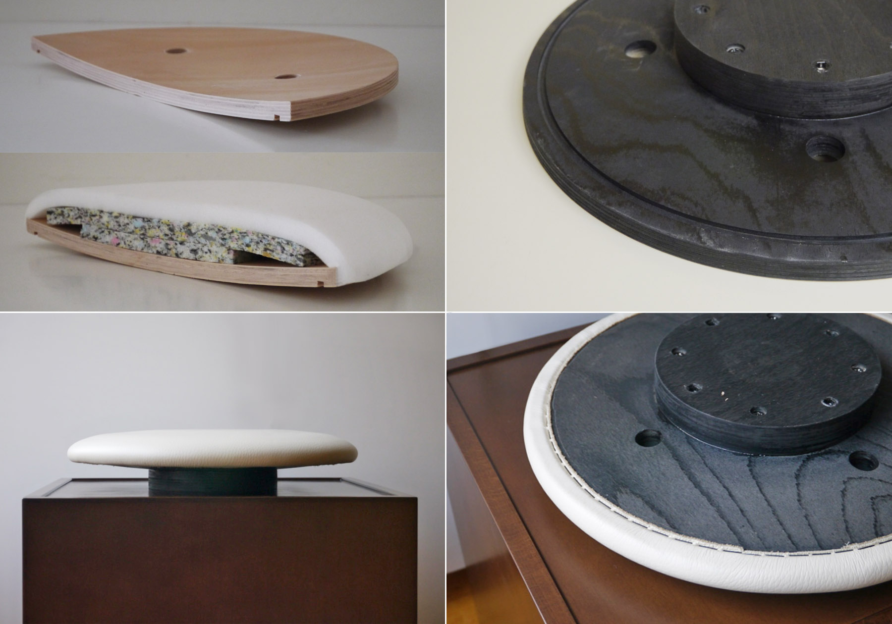 一見何の変哲も無いボックスのベースの細部にも、美しく、使う人のことを考えたこだわりが詰まっています。ボックスは小口が見えないように45度留めで作られ、さらに角には5mm角の無垢材を回して面取りを施しました。持ち運ぶ際にぶつけても傷がつきにくく、また座ってる時に足が当たっても痛く無いようにデザインされました。ボックス上面の縁が無垢材によって立ち上がっているのにも理由があります。CIRCOLO Ⅱは積み上げて置いておくことができるデザインですが、上に積んだスツールの接地部のパーツがこの立ち上がりにぴったりと収まり、ズレることが無いようになっています。更に積み上げた際にも下のスツールと若干隙間ができることで美しく、角が傷つかないデザインです。