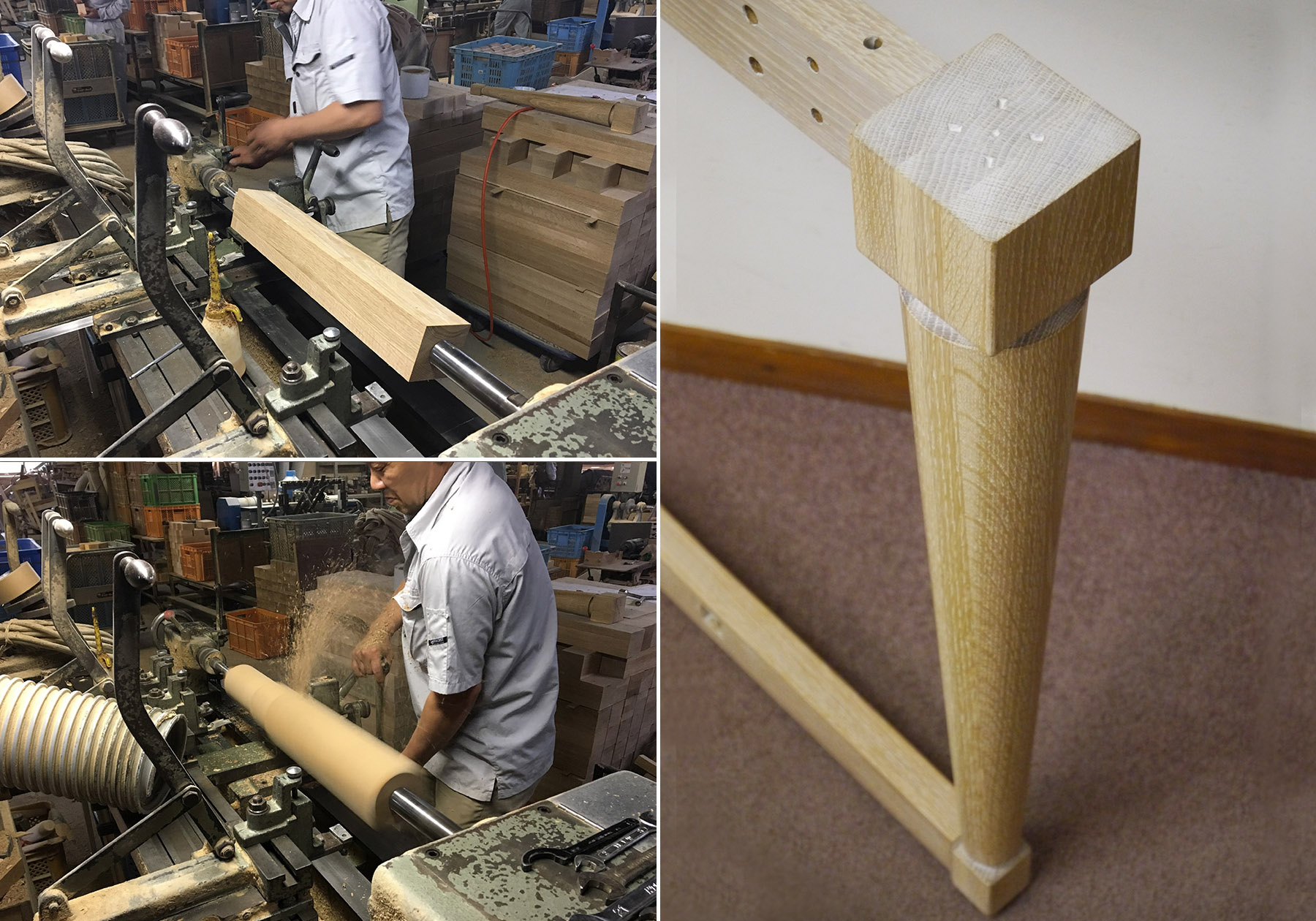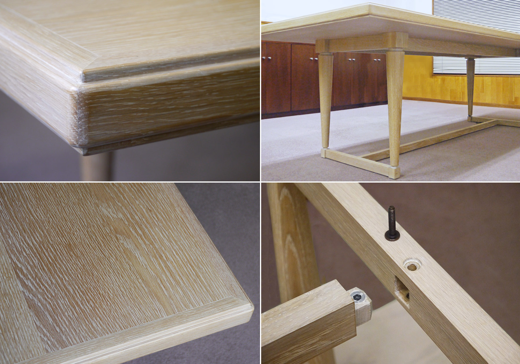 サイズはW1800×D900、W2100×D1000、W2100×D1000と、φ1200、φ1500のラインナップ。素材はホワイトオークを使用し、フレームには無垢材を、天板トップには厚突きの突き板を使用しました。木材の表情をより引き出すためにうずくり加工を施し、D-6、D-7のヴィンテージ塗装は使い込まれた表情を出すため、一度塗った塗料を適度に磨き落とし、もう一度仕上げの塗装を施しています。天板の小口には贅沢に厚みのある無垢材を回し、クラシックなテイストを表現する面取りを施しました。天板トップの突板は板目をランダムに組合せることでホワイトオークの素材感を最大限に引き出し、無垢材のような表情を生み出しています。クラシカルな脚部は割れが出ないよう、乾燥させたホワイトオークの無垢板を三枚はぎ合わせて手加工でろくろ加工を行い、シャープなエッジが際立つようにしました。脚下の貫はシンプルな構成ですが、金物が表面に出ないようホゾに金物を埋め込み、裏からボルトで止める仕口です。