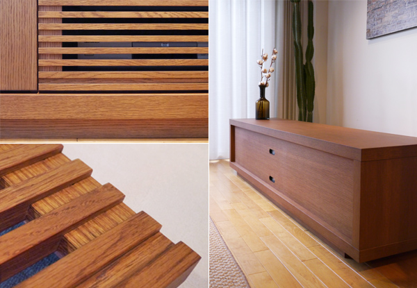 MD-301NはシンプルでスクエアなMD-301の特徴はそのままに、素材を表情豊かなオーク材に、端部の面取りも大きめに変更し、柔らかな印象になりました。テレビの大型化に対応し、W1800に加えてW2100、W2400のモデルを追加。オープンタイプに加え、フラットな板扉、ガラスをはめ込んだ框扉、スタイリッシュなルーバー扉の3種のフラップ扉からお選びいただけます。ガラス扉はガラスの納め方を丁寧にデザインし、ルーバー扉は各部材を塗装してから組み立てる事で、複雑な構成でありつつも細部まで美しい仕上がりになっています。また、両サイドの開き扉にはソフトに閉まるダンパー機能のあるスライド蝶番を、フラップ扉にはゆっくりと開くソフトダウンステーを採用し、スムーズで静かな使い心地を感じて頂けます。機器の配線穴は上下に二つ設けてあるため、内部の配線が美しく納まります。そして本体の背面は前面、側面同様に仕上げられているため、テレビボードとしてだけでなく、空間を区切る間仕切りとしてもお使い頂けます。