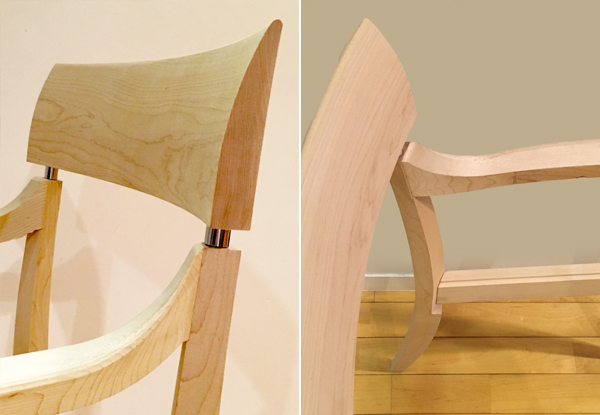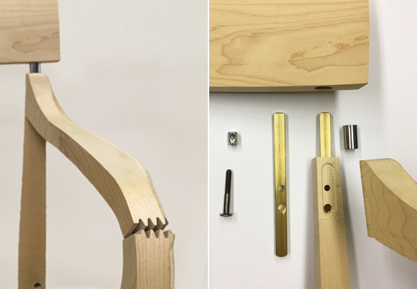 006-MODELを印象づける滑らかなアームと前脚は、強度を高めるためフィンガージョイントという技法で接合されています。フィンガージョイントは精度が強度に直結する高度な加工技術が求められる仕口です。各パーツを削り出してから接合することにより、複雑な曲面を作り出すことに成功しています。背板と後ろ脚を接合するジョイントはデザインのアクセント。直径12mm真鍮製のローレットを使用しています。そして後ろ脚の接合部は背の当たりを考えてカーブを描き、無垢材を削り出した背板の曲面につながります。人の身体に沿わせるという、あくまで座る人のことを考えた曲線が椅子のデザインに一貫した動きと流れを生み出しました。座面は5層のウレタンと、ダイメトロールという布バネを組み合わせて使用しているため、しっかりした感触でありながらも柔らかで快適な座り心地です。