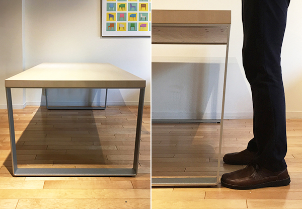 脚先に向けて若干テーパーが掛かった脚の形は、近くに立った際にスチールの脚部につま先がぶつかりにくいという機能と、天板の揺れを抑えるという構造の要求から出来上がりました。必然的に出来上がった形ですが、シンプルなテーブルに動きを与えるデザインです。補強材などでデザインが崩れないように加工限度ぎりぎりの9ミリ厚のスチールで出来ています。脚のカラーはスチールの素材感を表現するマットなシルバーとブラック。脚部の取り付け位置は100ミリピッチで四段階に変えることができます。空間のイメージや使い方に合わせてコーディネートしてみてはいかがでしょうか。
