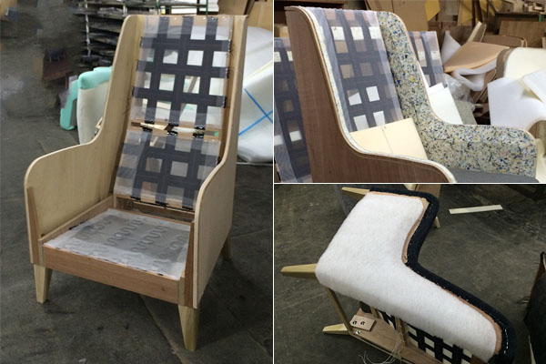053の構造は、体重を支える座に鋼製ウェーブバネを木フレームにしっかりと固定、その上に多層のウレタンとスーパーソフトウレタンを使用したクッションを置きました。特徴のハイバックの背は弾性ベルトをクロスに組み上げ、腰の当たりはしっかりとしたウレタンフォームを使用、背から頭にかけては雲の上に寝ているような柔らかさを出すためにスーパーソフトウレタンを多層に重ね、背骨のカーブに沿うような形状に作られています。その柔らかな座り心地は女性(150センチ)から男性(190センチ)の方まで、巾広い身長の方に、快適にご使用いただけるように、開発時に試作を重ね細かなモジュール設定を行い完成させました。