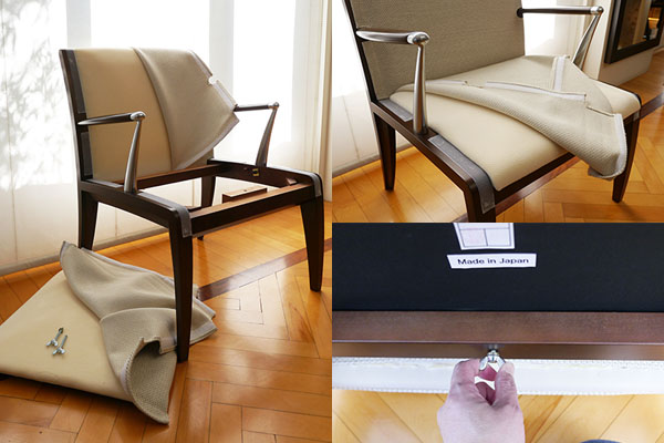 ゼフィーロ・ラウンジはメープル材のフレームに、布バネのダイメトロールを使用したクッション性の高い座と、テーブ材で編まれた背にウレタンフォームを組合わせた背、その上から面ファスナーにてカバーリングが取付けられます。アームは下部には強度が高いアルミ鋳造パーツと肘部には温かみのあるメープル材を使用し、柔らかなカーブと共に手触りの良い仕上げになっています。