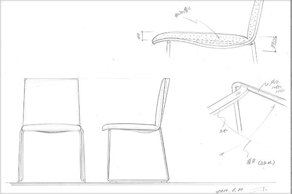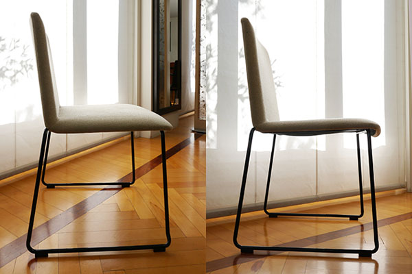 MD-202のデザインは、A-modeのブランドイメージのアメリカ西海岸のモダン住宅をイメージした、シンプルでスクエアなデザインです。フラットな座と背がシンプルなストレートなスチールパイプのフレームに乗ったとてもシンプルなデザインで、一見硬そうな印象を受けます。しかし、腰掛けると、固めのウレタンと驚くほどの深みのある描け心地に驚かれると思います。合板の上に薄いクッションが乗っただけの椅子に見えますが、実はお尻を乗せる座の部分が丸くお椀のようにへこんでいて、そのへこみを隠すような厚みのクッションが座の中心部に使われているからです。座の周りは25ミリのウレタンフォームを使用していますが、座には40ミリのウレタンフォームが使われています。その座を受ける脚部は存在感を無くすようにとても細いパイプが使われます。しかし、スチールパイプは車やバイクにも使われるハイテンション鋼を使い強度にもこだわりました。